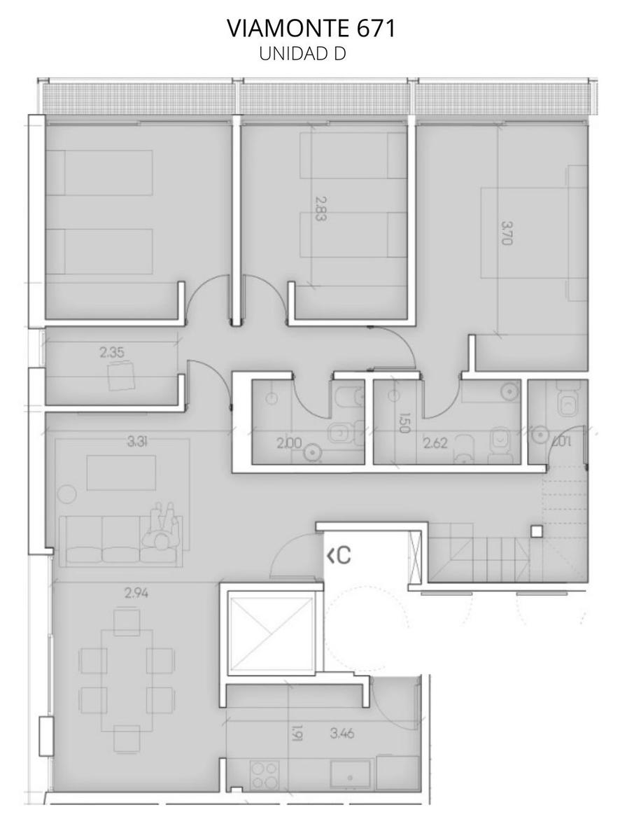 DEPARTAMENTO DE 3 DORMITORIOS AL CONTRAFRENTE DE 217.74 M2 (106.66 M2 + 8.41 M2 DE BALCONES + 97.54 M2 DE TERRAZA EXCLUSIVA + 5.13 M2 DE BAULERA). DOBLE INGRESO. COCINA EQUIPADA SEPARADA DEL LIVING COMEDOR. TRES DORMITORIOS (EL PRINCIPAL EN SUITE). OTRO BAÑO COMPLETO. TOILETTE DE RECEPCIÓN.