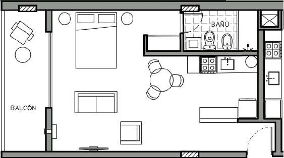 Monoambientes contrafrente de 46 m2 (38 m2 cubiertos + 8 m2 de balcón): Cocina equipada. Placard. Baño completo.