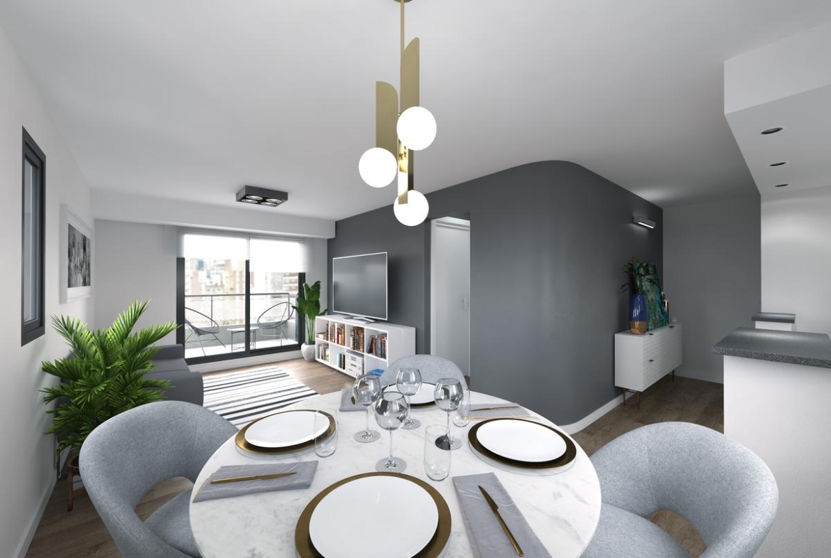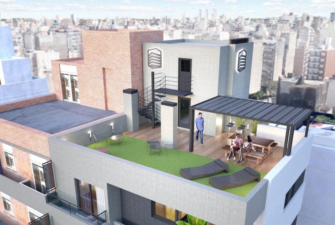 Departamentos semipiso de 1 dormitorio al frente de 44 m2. 37 m2 y 7 m2 de balcón corrido. Ingreso a living comedor con salida al balcón. Cocina equipada semiseparada por barra desayunadora. Un dormitorio con placard y salida al balcón. Un baño completo.