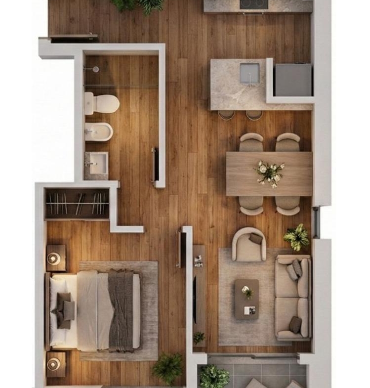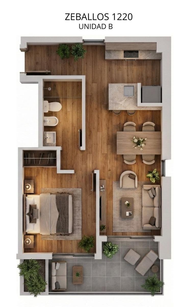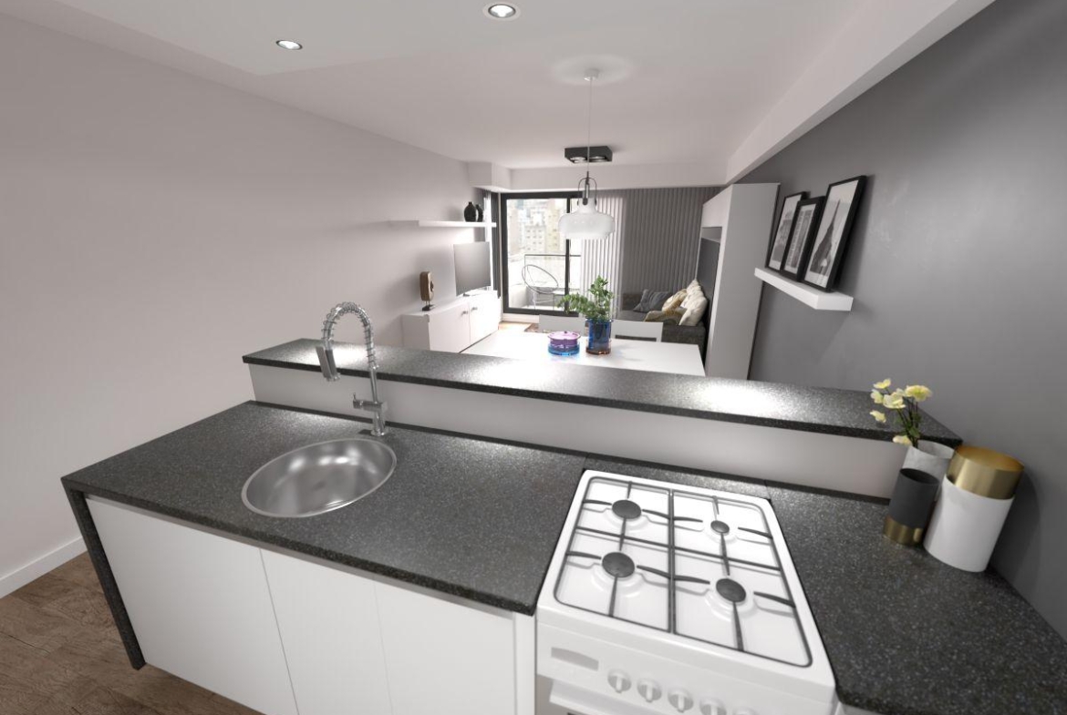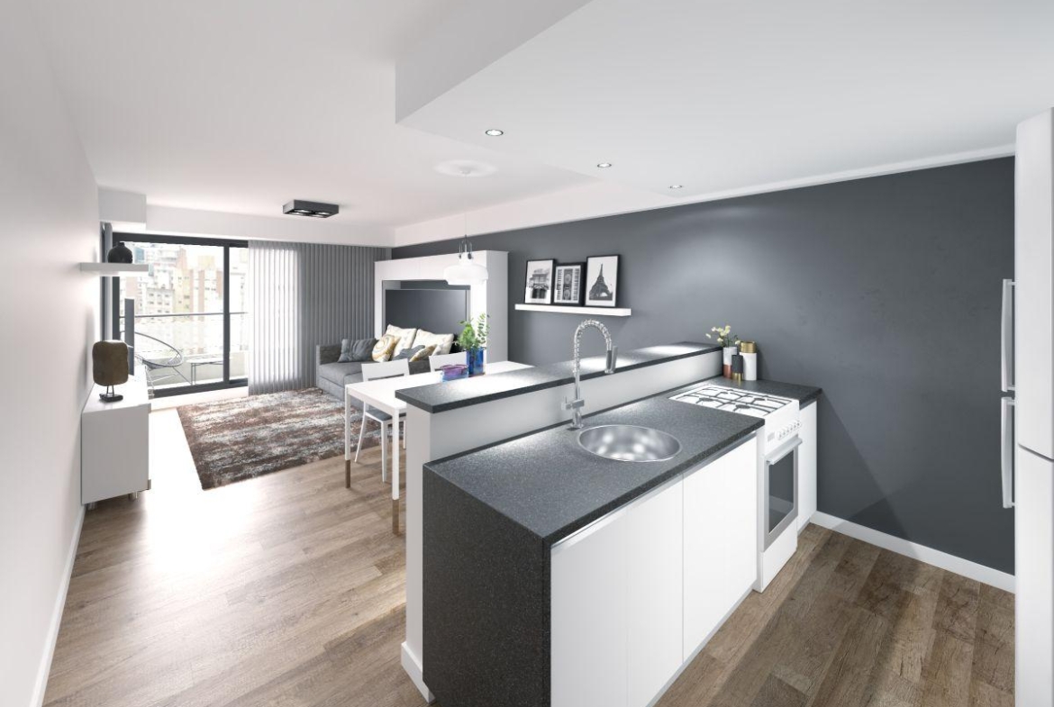 Departamentos semipiso de 1 dormitorio al frente de 44 m2. 37 m2 y 7 m2 de balcón corrido. Ingreso a living comedor con salida al balcón. Cocina equipada semiseparada por barra desayunadora. Un dormitorio con placard y salida al balcón. Un baño completo.