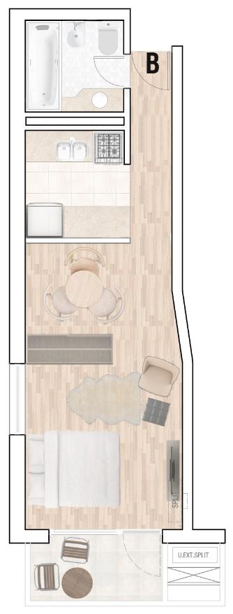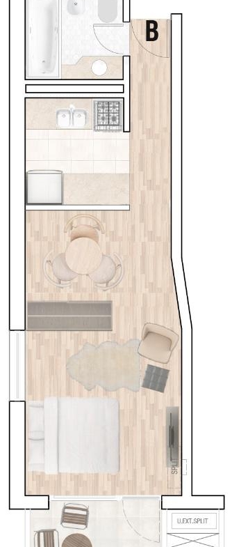 MONOAMBIENTE A ESTRENAR DE CALIDAD EN BARRIO MARTIN DE 34,1 M2 (30,5 M2 CUBIERTOS + 3,6 M2 BALCÓN): AMPLIO AMBIENTE CON SALIDA AL BALCÓN AL FRENTE. COCINA SEMISEPARADA POR BARRA DESAYUNADORA EQUIPADA. UN BAÑO COMPLETO.
