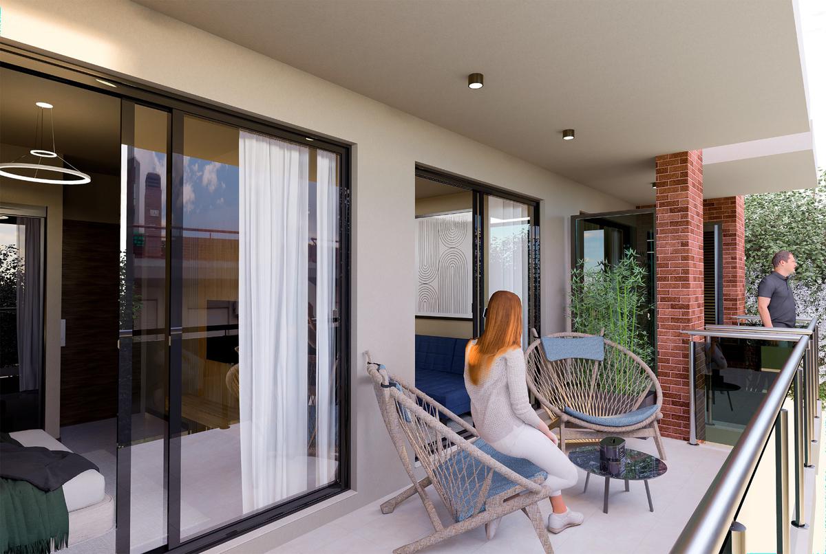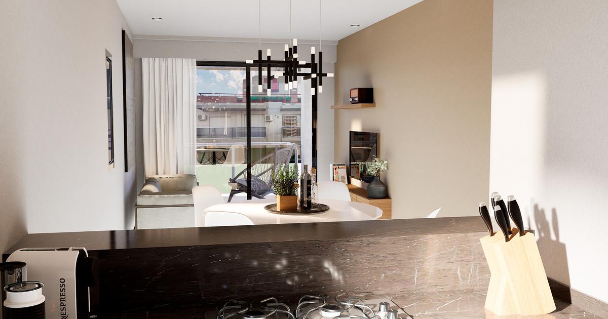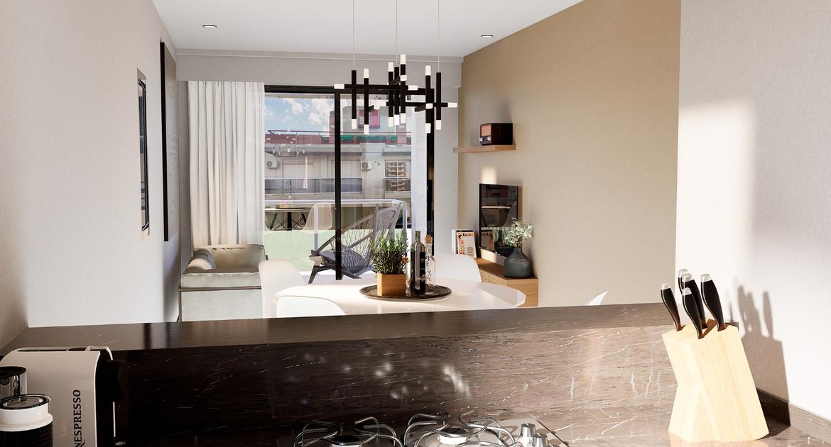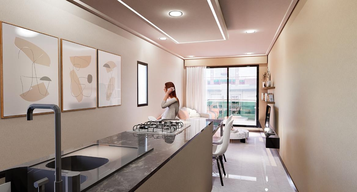 Departamento de 1 dormitorio contrafrente de 44,90 m2. 38,20 m2 + 6,70 m2 de balcón. Amplio estar comedor. Cocina semi separada con barra. Un baño completo. Balcón.