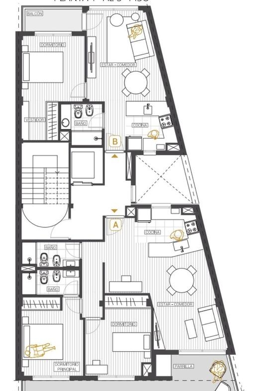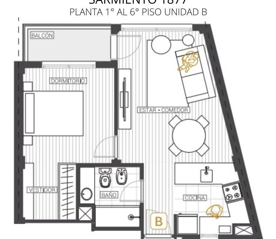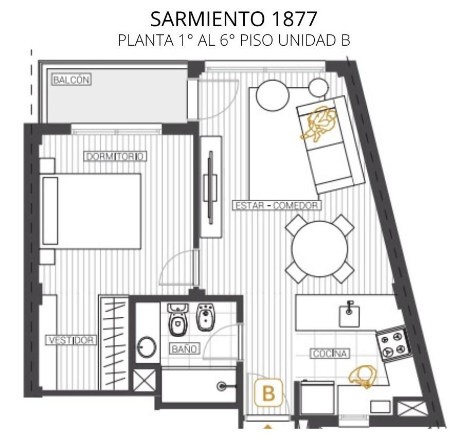 1° Piso B contra frente 49m2 (45,18m2 + 3.84m2 de balcón)