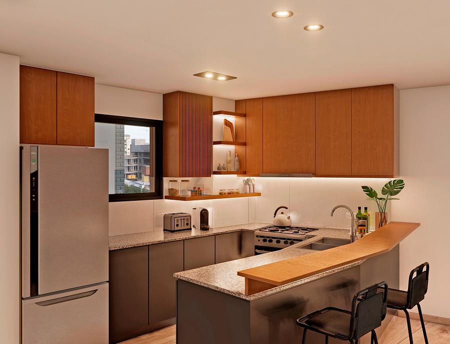 Cocina semi separada con una generosa barra desayunadora. Completos amoblamientos bajo mesada y alacenas. Artefacto de cocina y calefón.