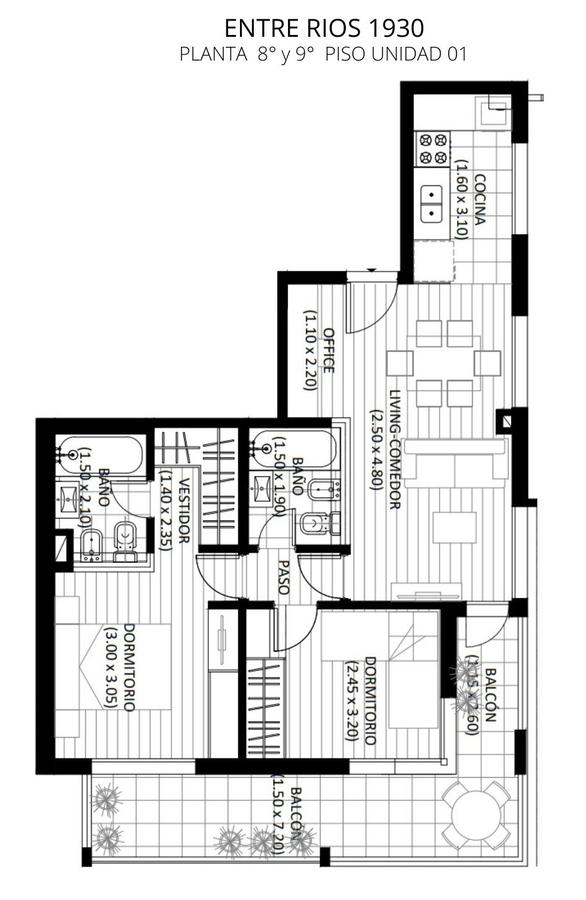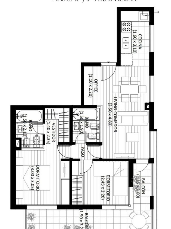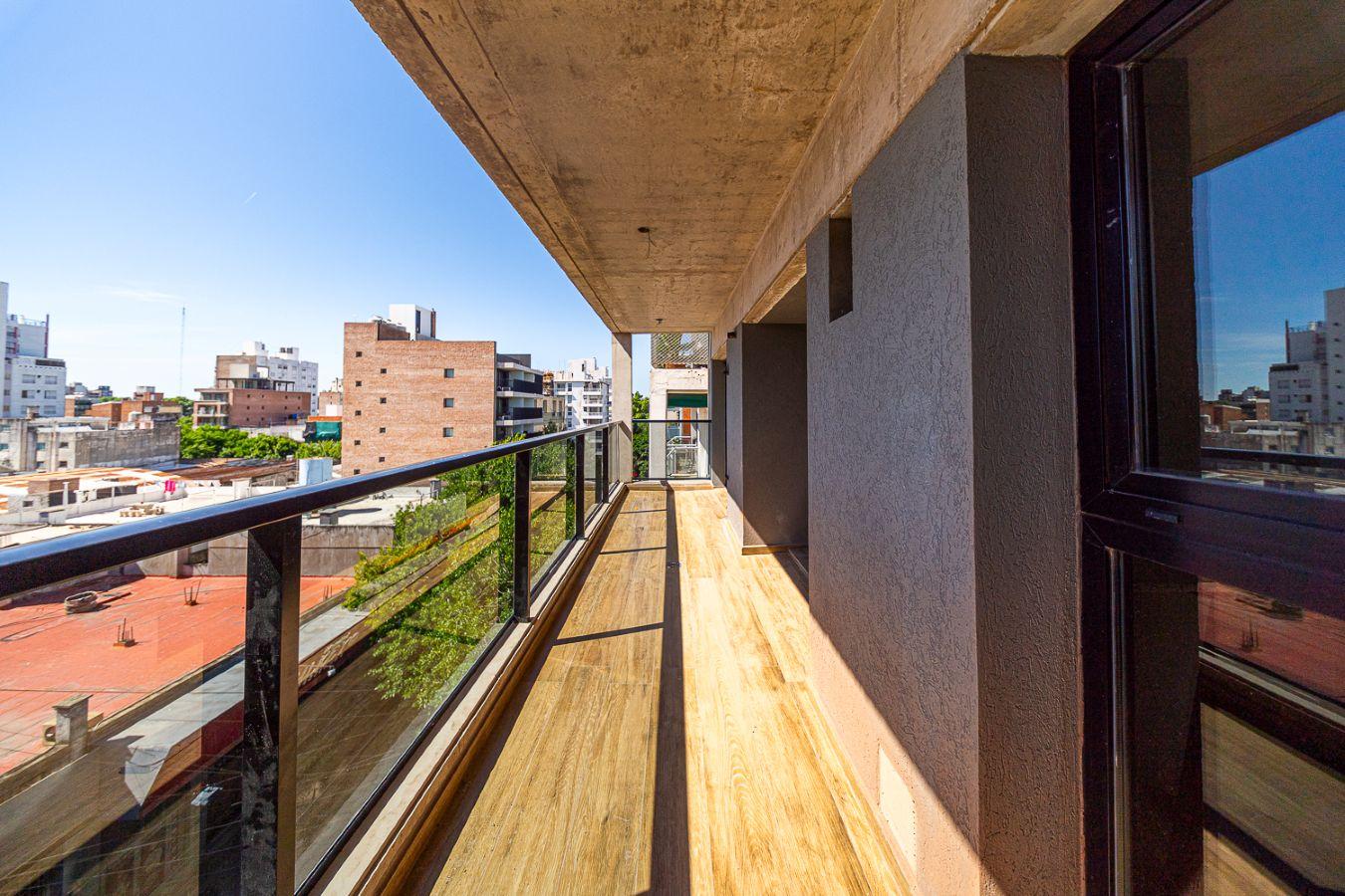 Departamento de dos dormitorios al frente de 64.87 m2 (51 m2 cubiertos + 13.87 m2 de balcón terraza): Cocina totalmente equipada semi separada del living comedor. Un baño completo. Office. Dos dormitorios, el principal con baño en suite y vestidor. Balcón terraza.