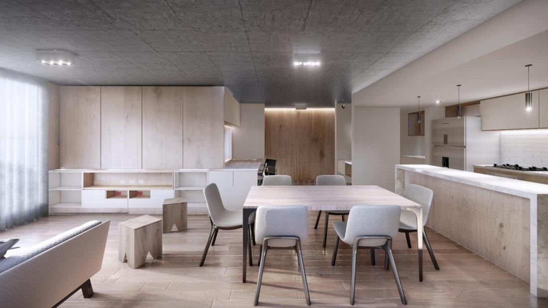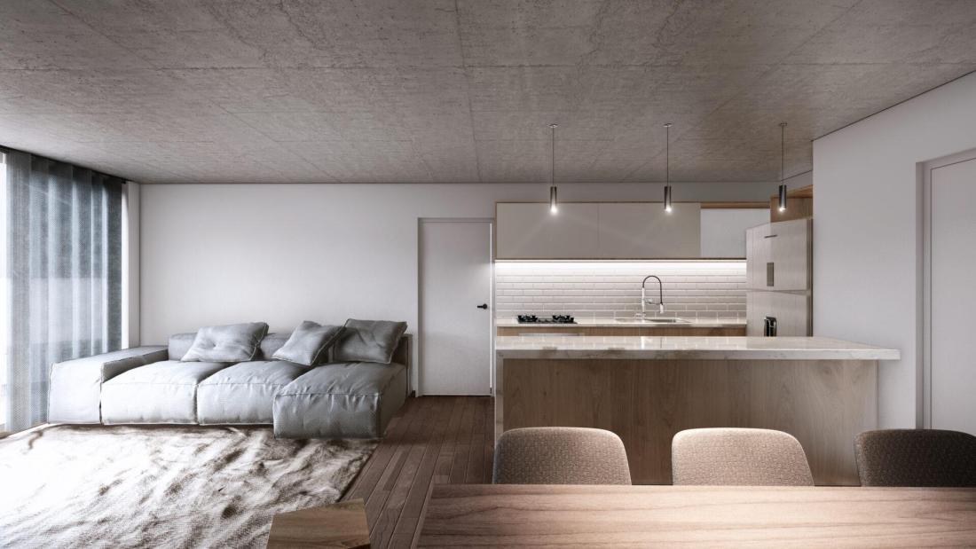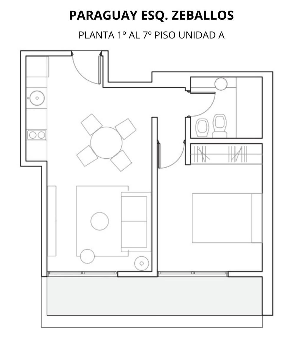 Departamentos de 1 dormitorio con frente Norte de 46 m2 (39 m2 cubiertos y 7 m2 de balcón). Living comedor con cocina integrada y balcón corrido al frente sobre calle Zeballos. Dormitorio con placard. Baño completo.