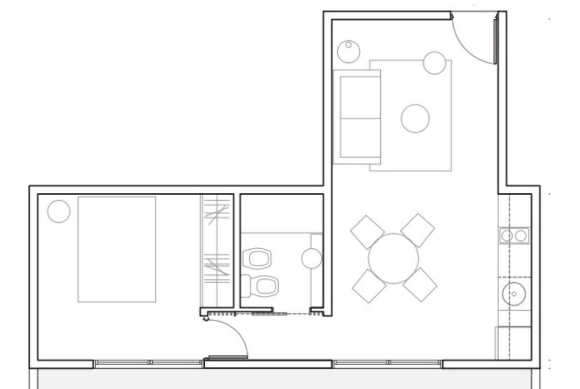 Departamentos de 1 dormitorio con frente Norte de 53 m2 (39 m2 cubiertos y 14 m2 de balcón). Living comedor con cocina integrada y balcón corrido al frente sobre calle Zeballos. Dormitorio con placard. Baño completo.