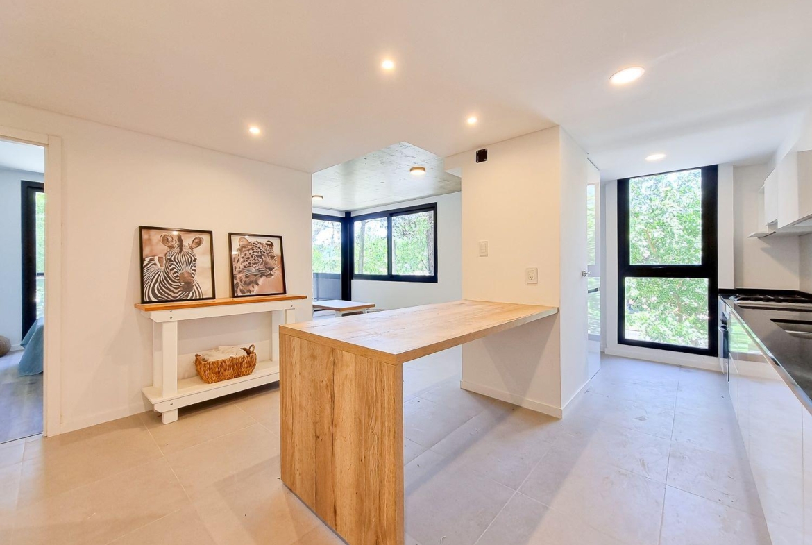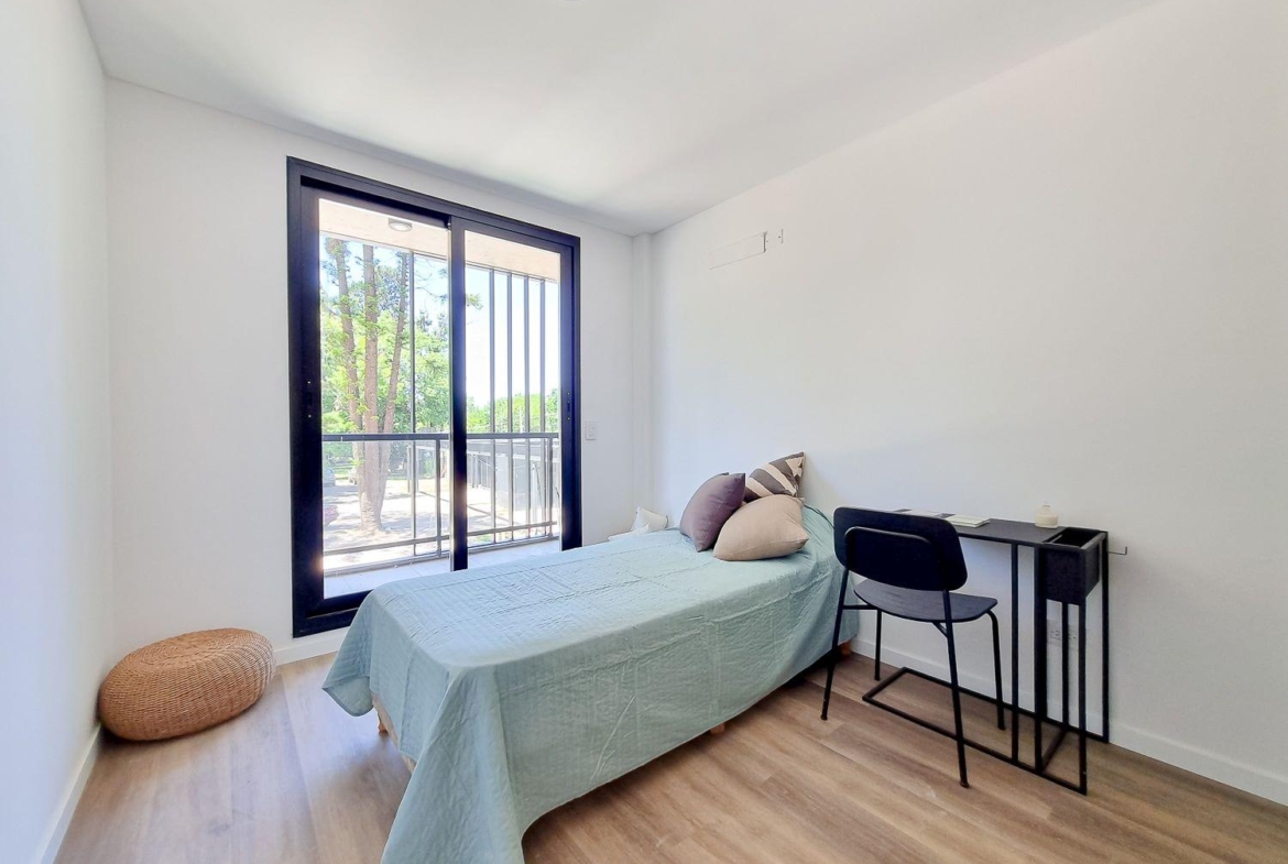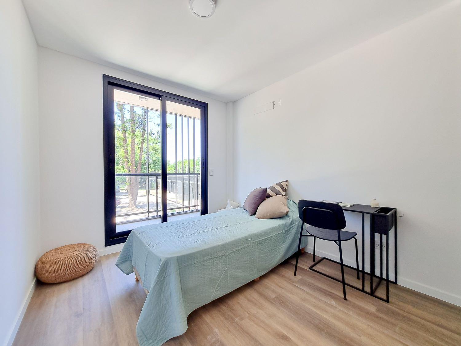 Amplios departamentos de tres dormitorios, Distribución eficiente que prioriza la funcionalidad y la relación exterior interior, aspecto fundamental dado el magnífico entono verde. Dos baños.