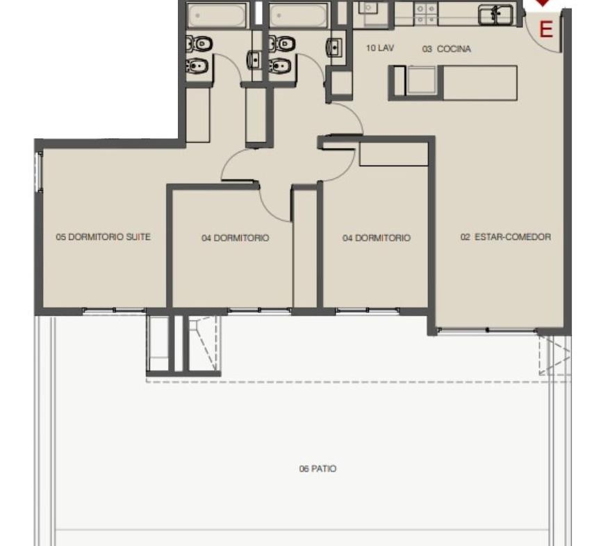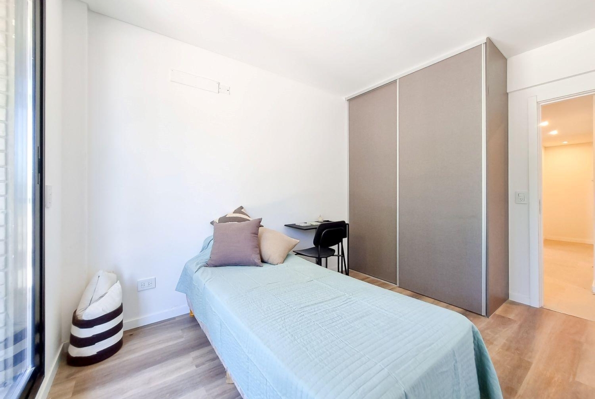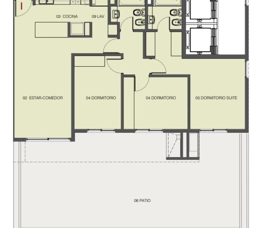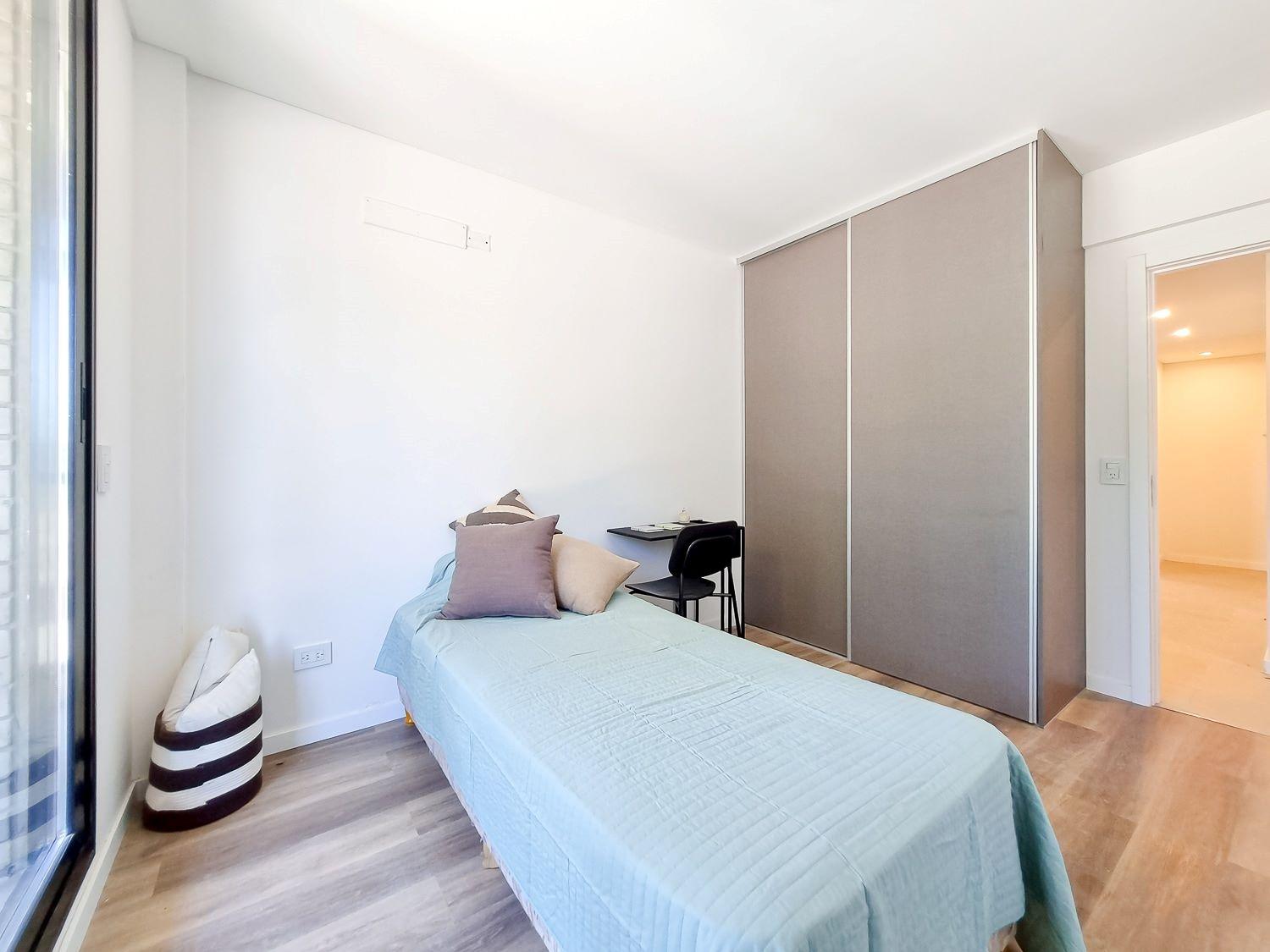 Amplios departamentos de tres dormitorios, Distribución eficiente que prioriza la funcionalidad y la relación exterior interior, aspecto fundamental dado el magnífico entono verde. Dos baños.