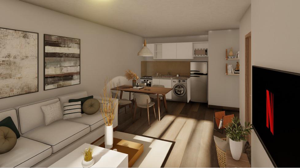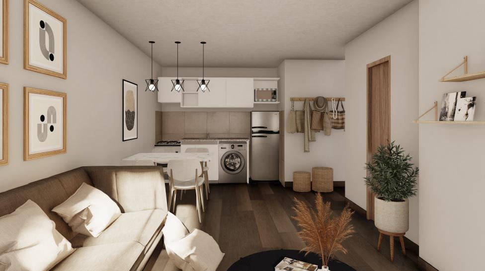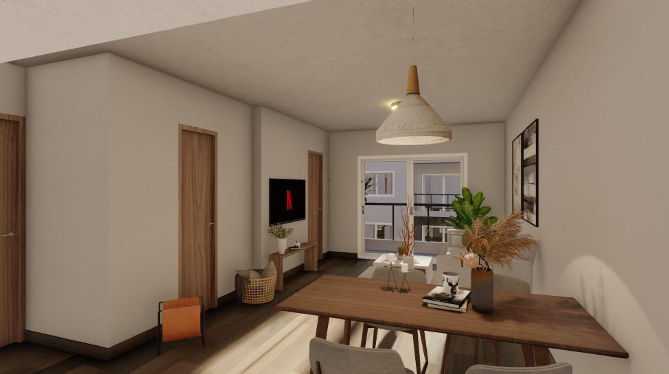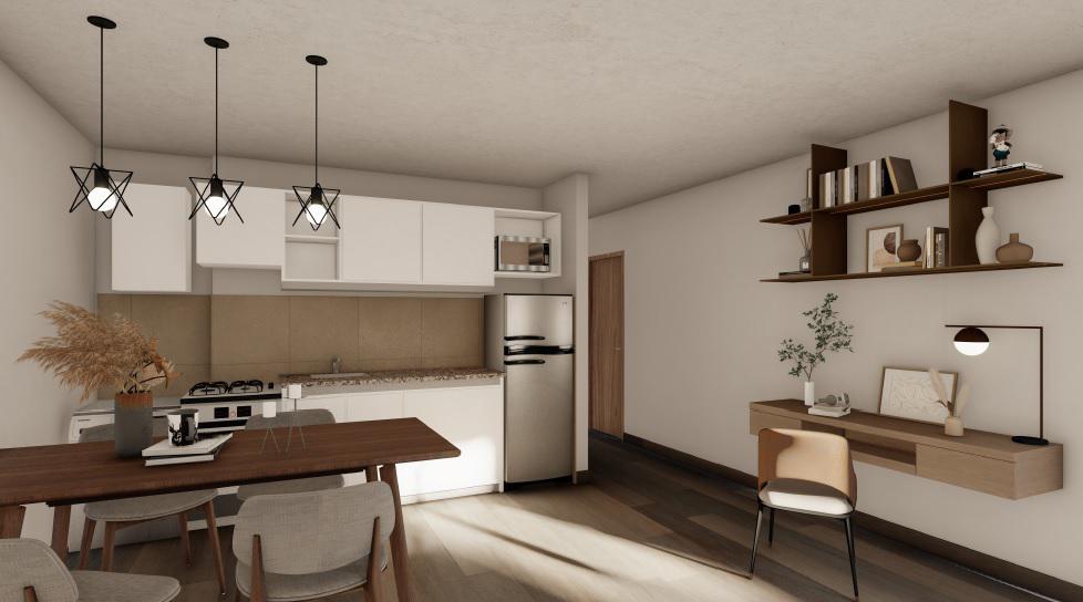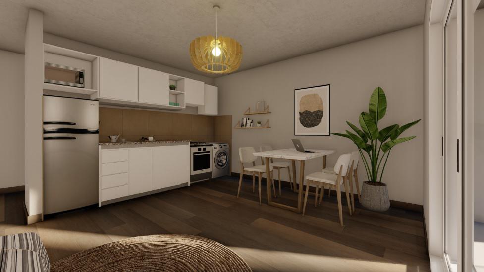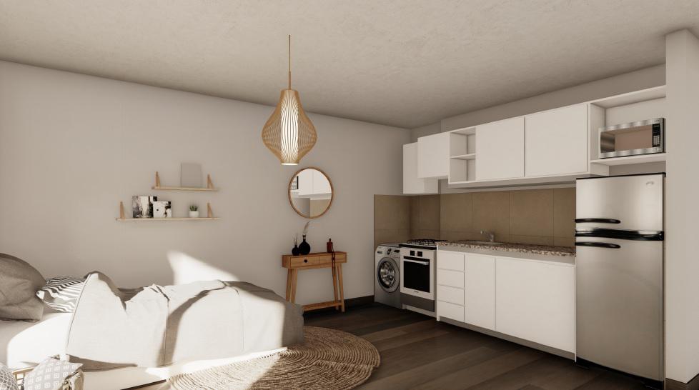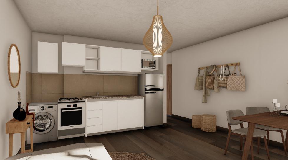 Pisos de porcelanato símil madera en todos los ambientes. Amoblamiento de cocina completo. Mesada de granito y bacha de acero inoxidable. (se entrega artefacto de cocina eléctrico o gas y termotanque eléctrico). Baños completos con receptáculo de ducha y grifería de primera calidad. Aberturas de aluminio. Yeso en paredes y cielorrasos. Persianas en todos los ambientes.