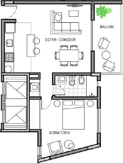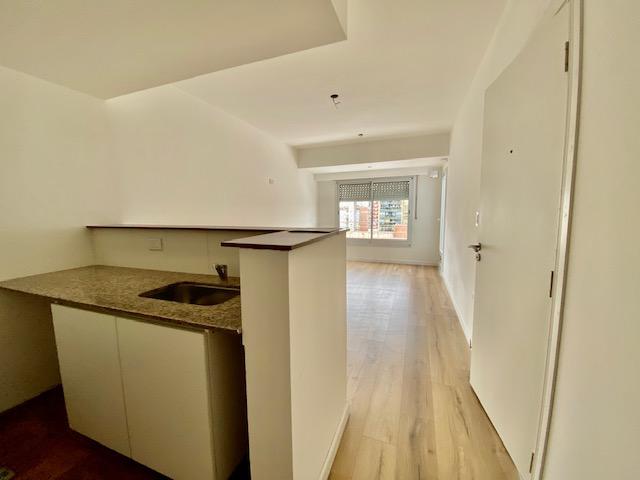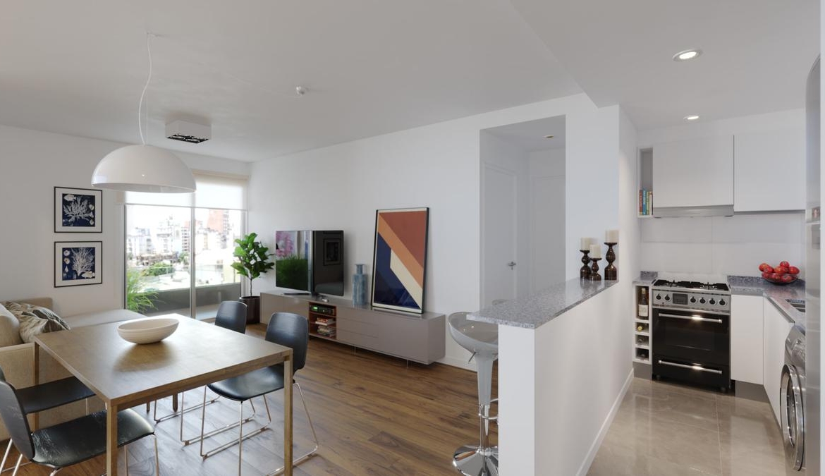 Departamentos de 1 dormitorio frente de 63 m2 (55 m2 cubiertos + 8 m2 de balcón): Cocina equipada incorporada. Dormitorio con placard. Baño completo.