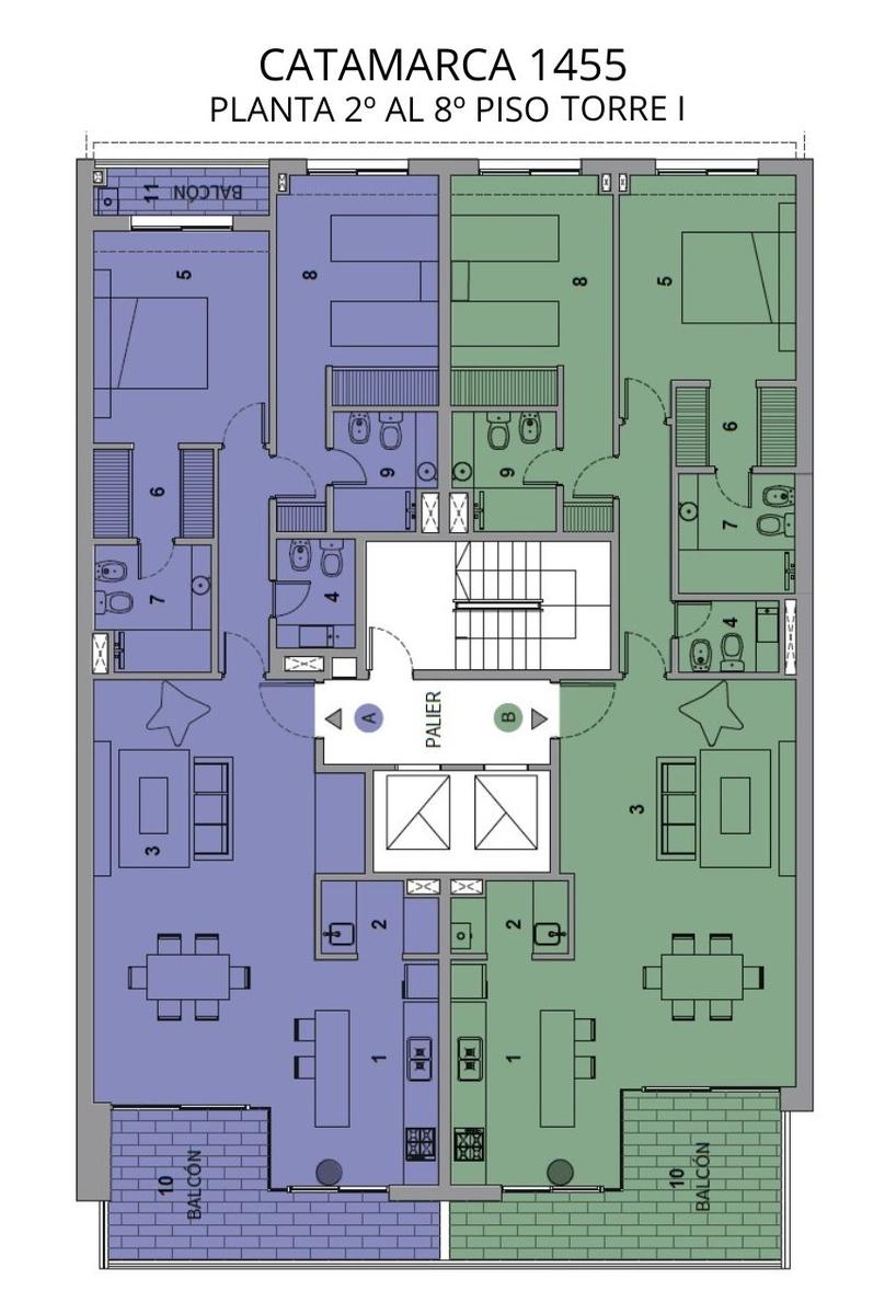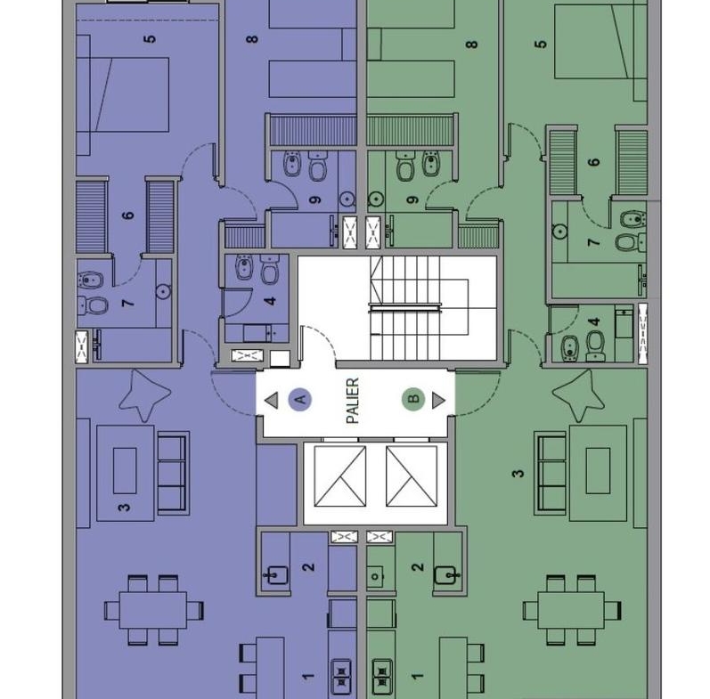 Semipisos de dos dormitorios de 107 m2 con balcón terraza frente, living-comedor integrado con la cocina con salida al balcón terraza al frente, dos baños completos en suite, un toilette, lavadero.