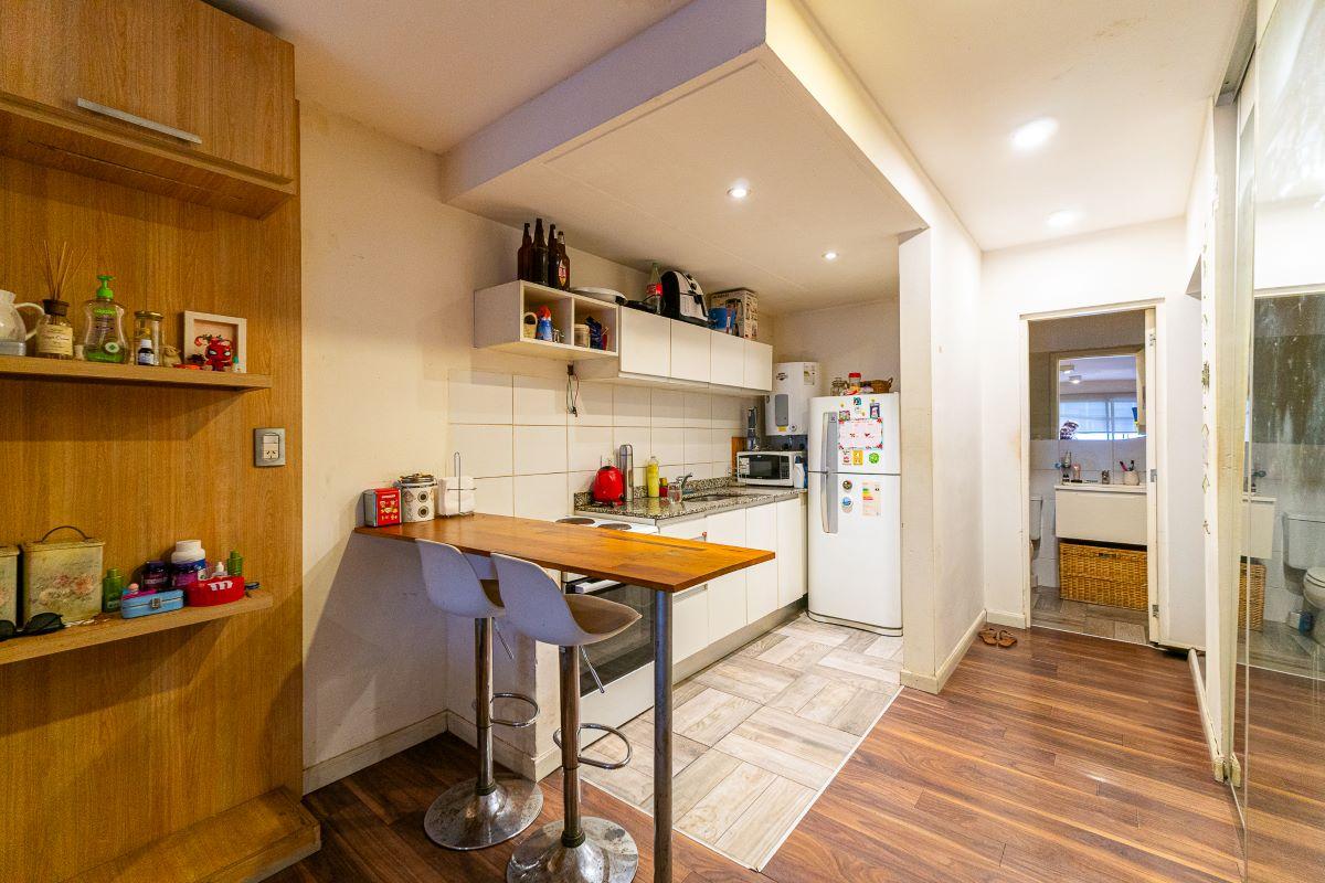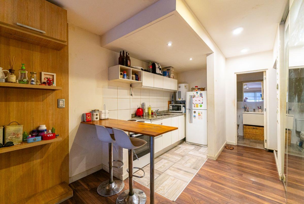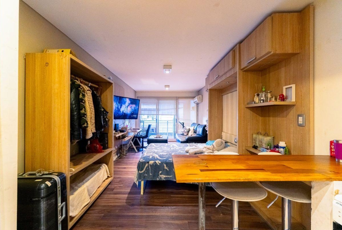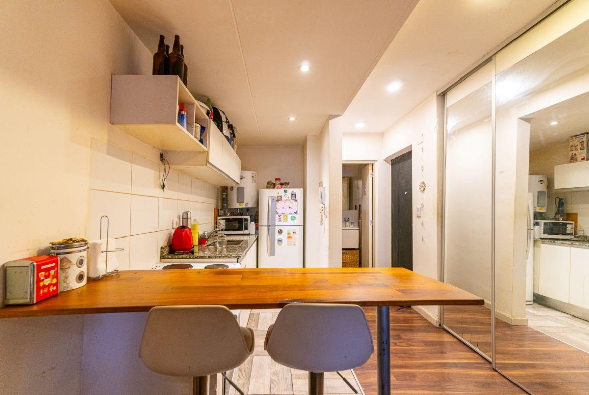 Ambiente luminoso con cocina completa semiseparada por barra desayunadora. Placard con interiores terminados y puertas espejadas. Baño completo. Totalmente equipado, Cocina, Heladera, Microondas. Aire split, Sillón. Muebles de madera.