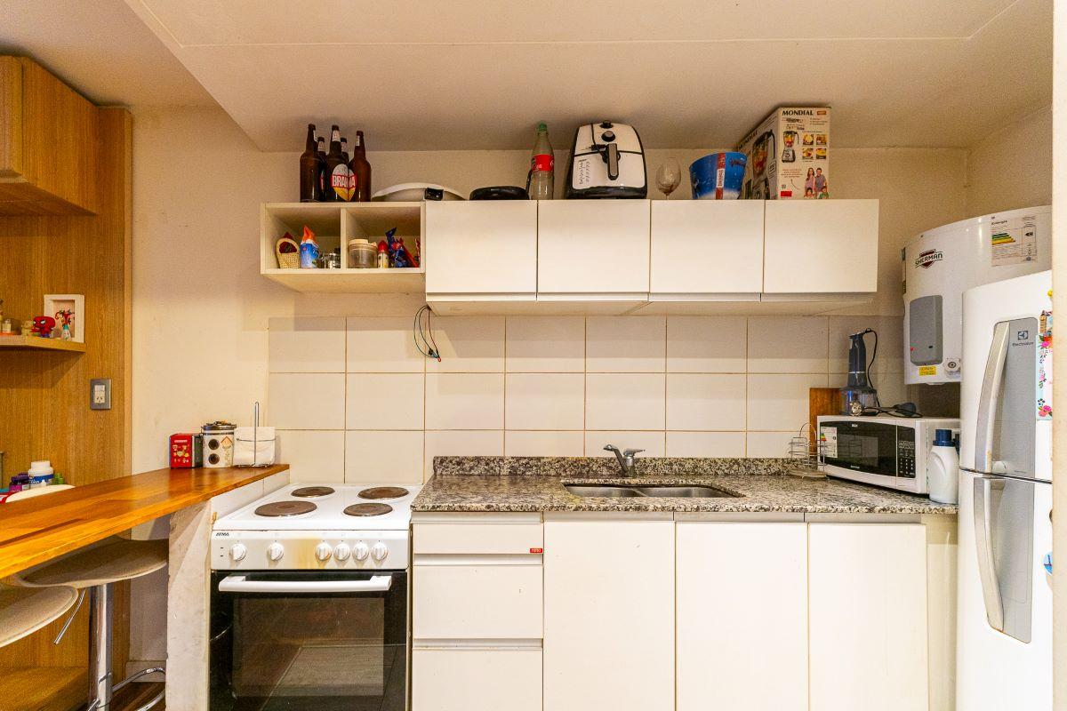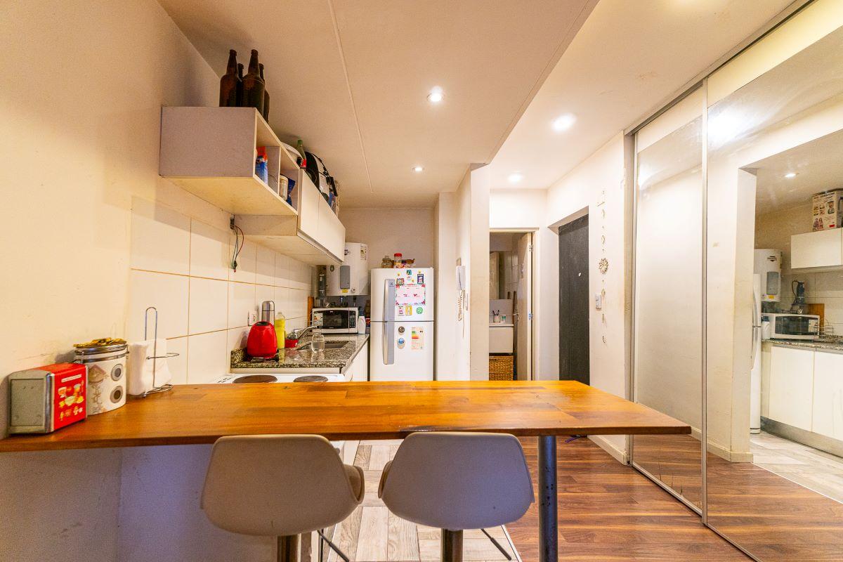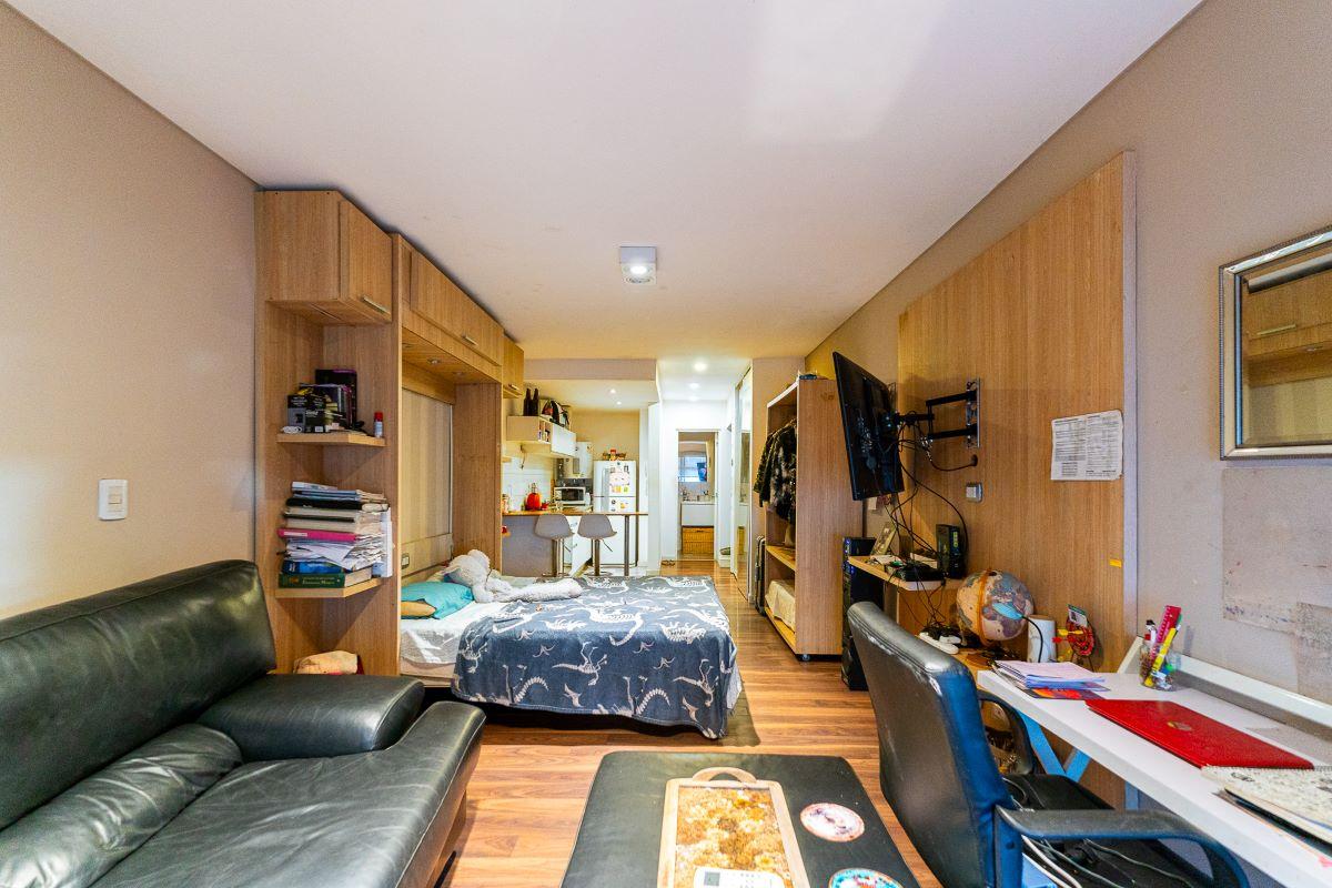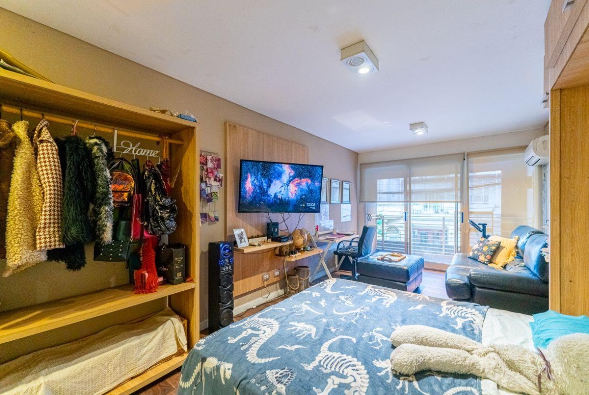 Ambiente luminoso con cocina completa semiseparada por barra desayunadora. Placard con interiores terminados y puertas espejadas. Baño completo. Totalmente equipado, Cocina, Heladera, Microondas. Aire split, Sillón. Muebles de madera.