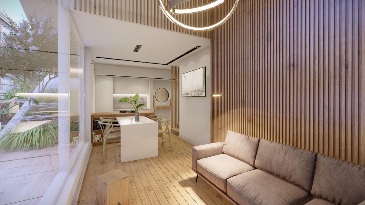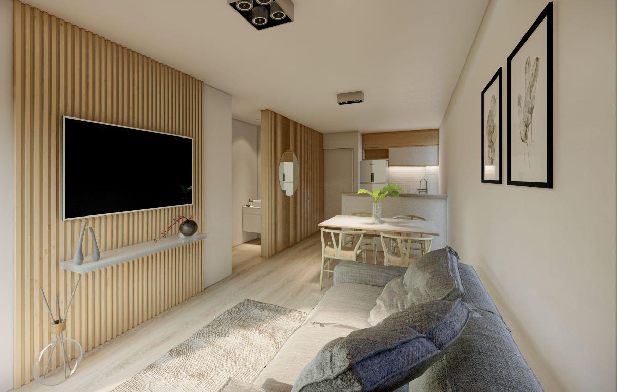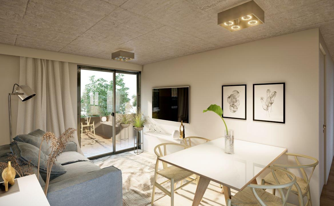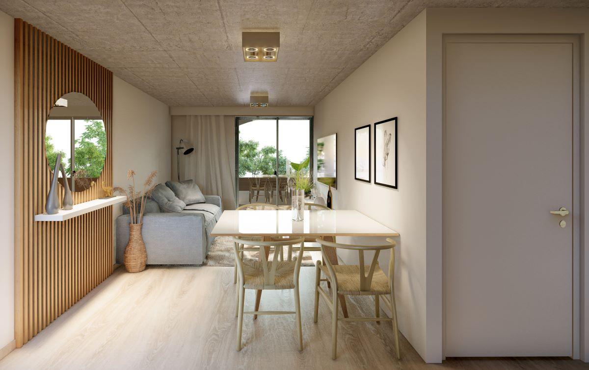 Acondicionamiento térmico. Pre instalación de AA. Porcelanatos en estar, comedor y cocina. Pisos flotantes en dormitorios. Revestimiento de porcelanato en baño y cocinas (en alzada mesada bajo alacena). Aberturas de primera calidad DVH. Frente de placares con puertas corredizas en MDF con guías de aluminio. Cielorrasos en hormigón visto en dormitorios y living. Equipamiento de baños: Artefactos Roca. Grifería FV. Bañera de chapa enlozada. Vanitory con bacha tipo Vessel. Equipamiento de cocina: Bajo mesada y alacenas de melamina de primera calidad. Mesada de granito. Bacha de acero inoxidable Johnson. Grifería Mono comando FV. Horno y anafe eléctricos colocados. Agua caliente: centralizada por medio de batería de termotanques.