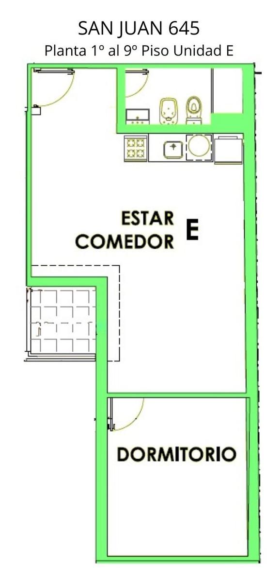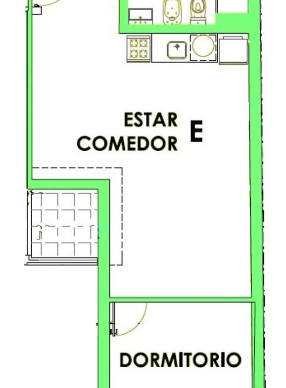 Departamentos E de 1 dormitorio internos miran hacia Torre I de 47.58 m2, 45.13 m2 exclusivos más 2.45 m2 de balcón. Amplio living comedor con salida al balcón. Cocina completa incorporada. Dormitorio con placard. Un baño completo.
