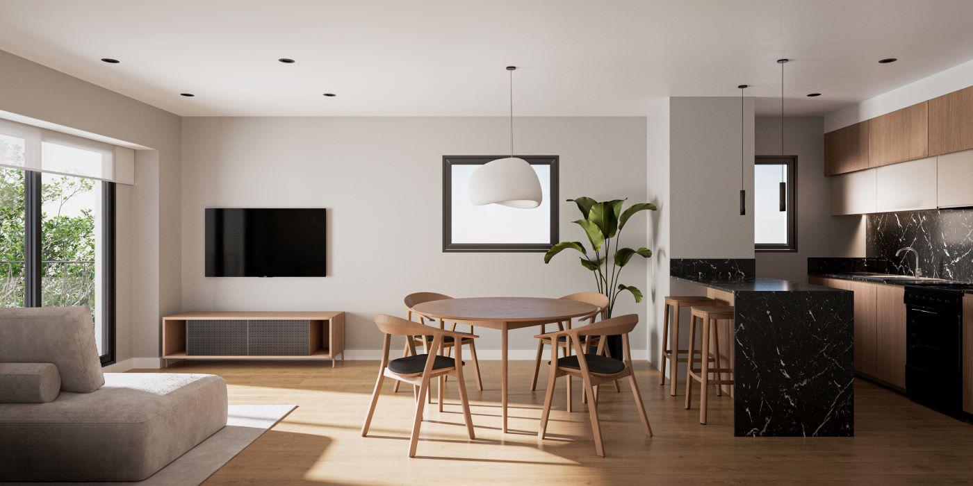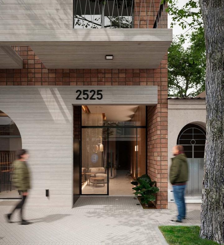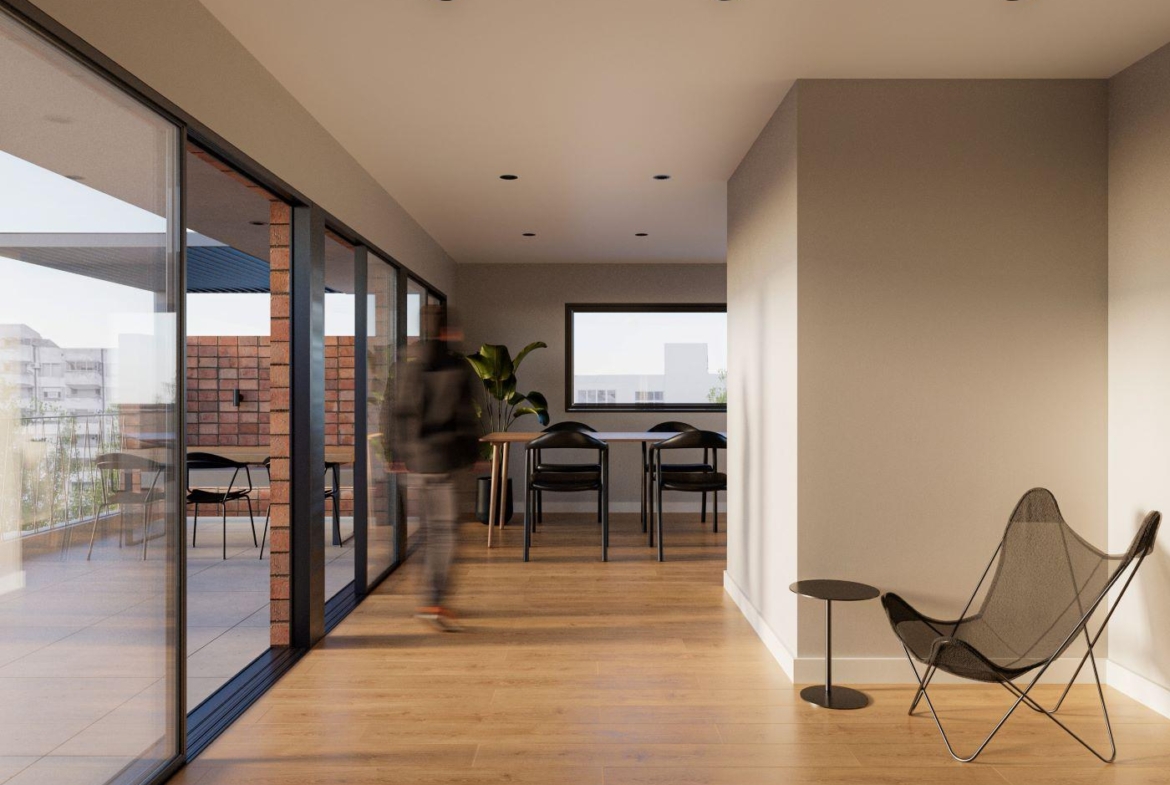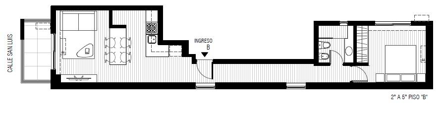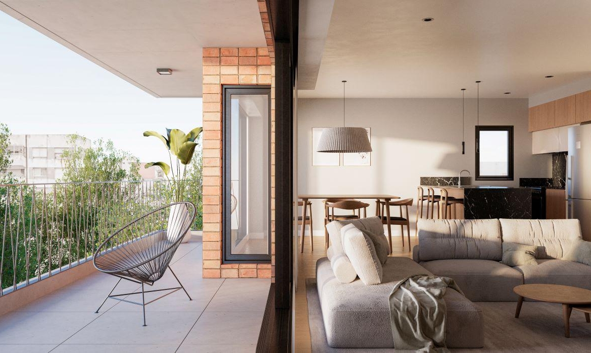 Departamentos de 1 dormitorio al frente con ventilación cruzada de 52 m2, 47.30 m2 cubiertos y 4.70 m2 de balcón. Amplio living comedor con cocina integrada con salida al balcón frente. Dormitorio con placard. Baño completo.