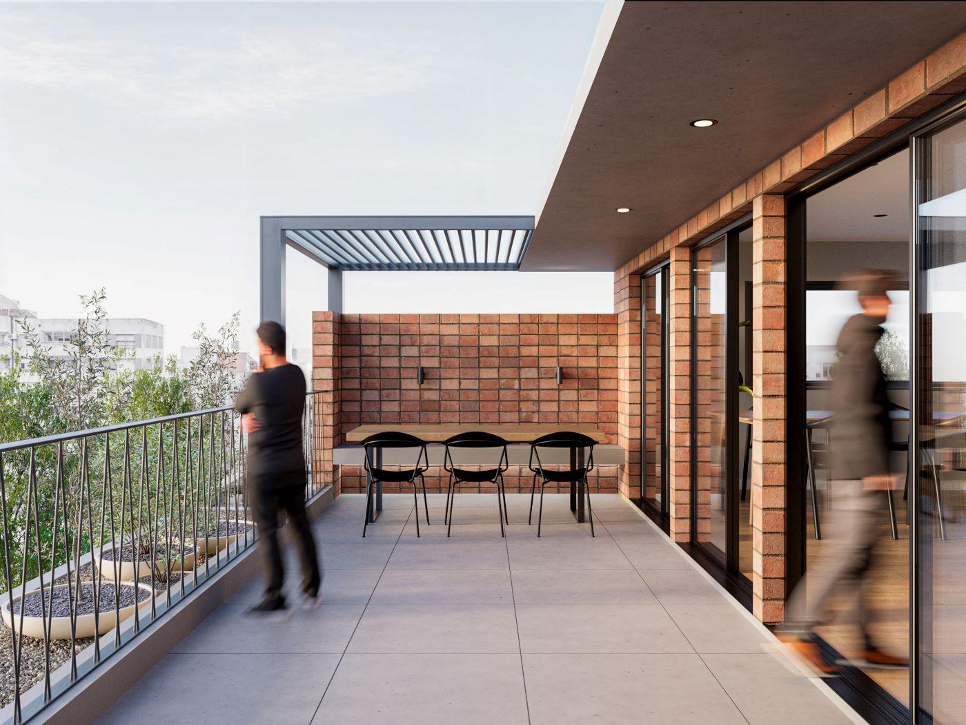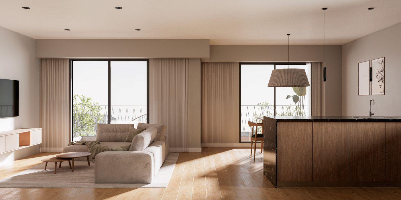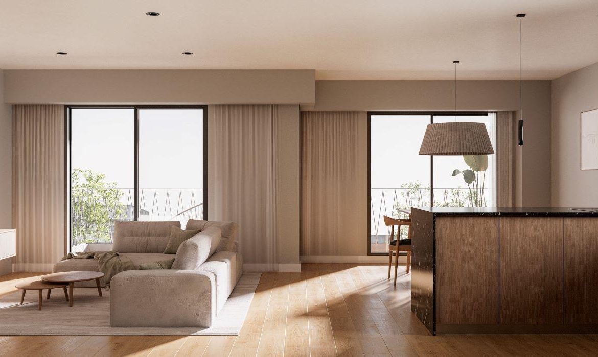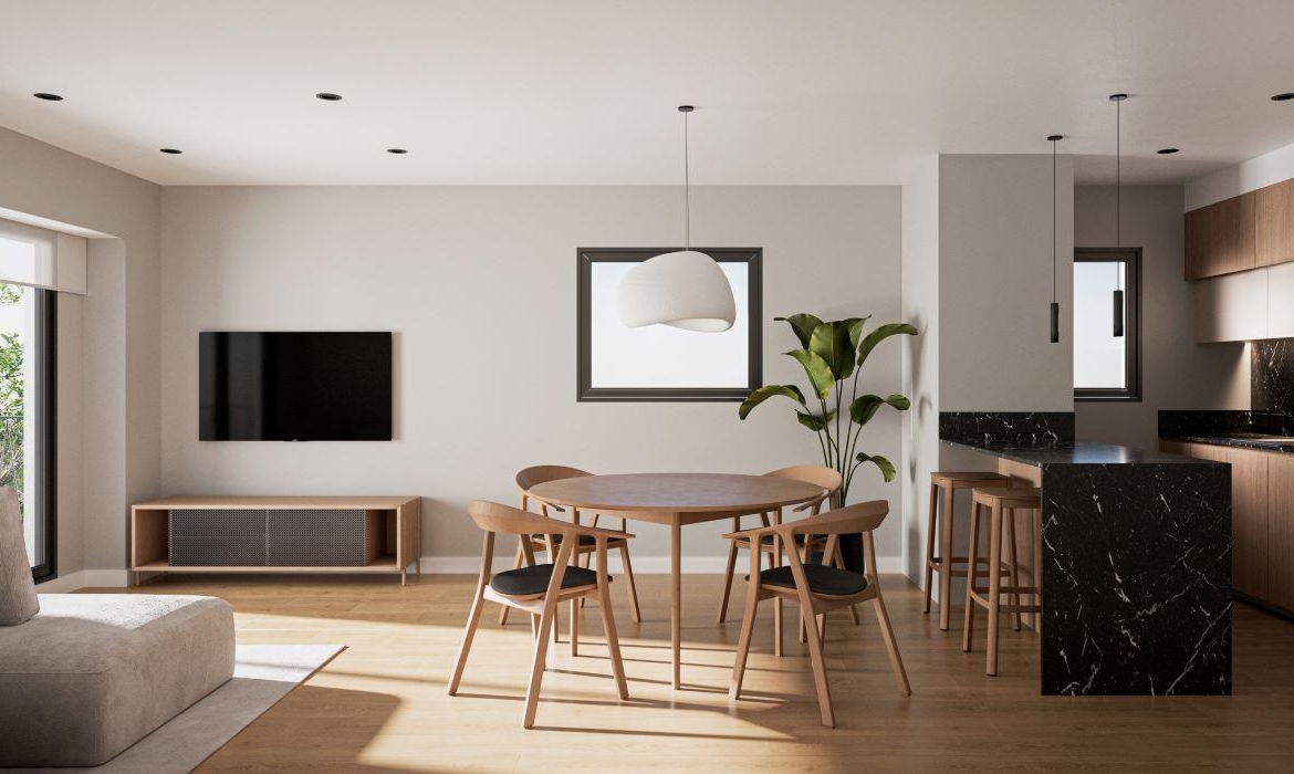 Departamentos de 1 dormitorio al frente con ventilación cruzada de 52 m2, 47.30 m2 cubiertos y 4.70 m2 de balcón. Amplio living comedor con cocina integrada con salida al balcón frente. Dormitorio con placard. Baño completo.
