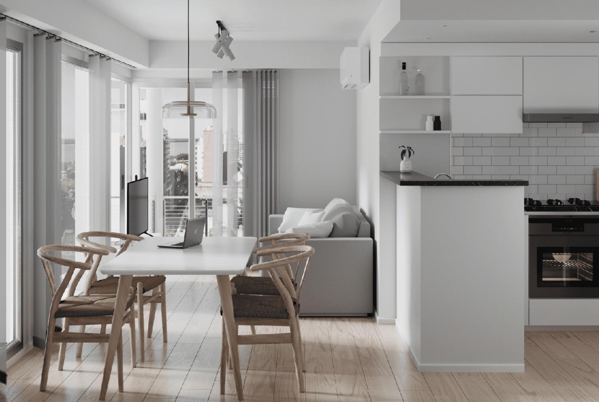 Departamentos de 2 dormitorios al frente en Esquina de 90 m2. 76,50 m2 cubiertos y 13,50 m2 de balcón. Cocina equipada semi separada por barra del living comedor. Dos baños completos. Dormitorios con placard, el principal en suite.