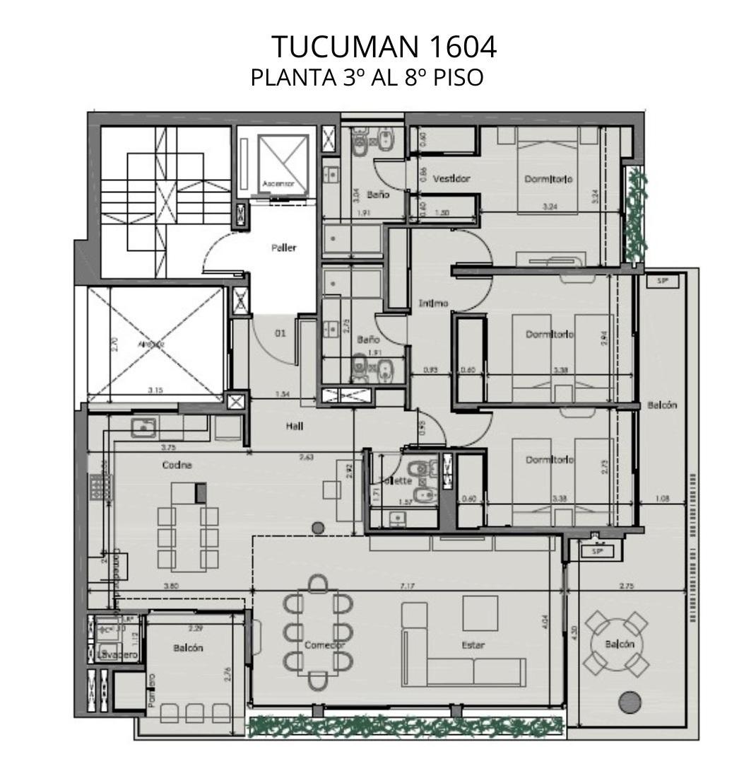 Piso exclusivo de 3 dormitorios de 167 m2, 131.5 m2 cubiertos, 29.50 m2 de balcones y 3.76 m2 de canteros. Cuenta con un amplio ingreso a cocina- comedor con salida a balcón con parrilla y lavadero, lugar para escritorio. Living-comedor con salida al balcón terraza. 3 dormitorios, 2 de ellos con placard, el principal con vestidor y baño en suite. Un baño completo. Toilette.