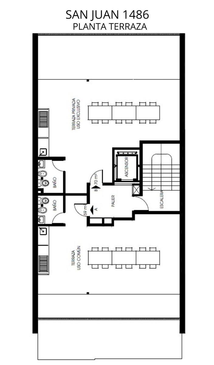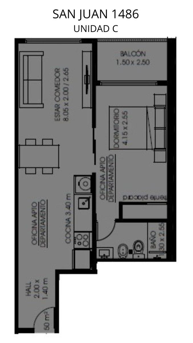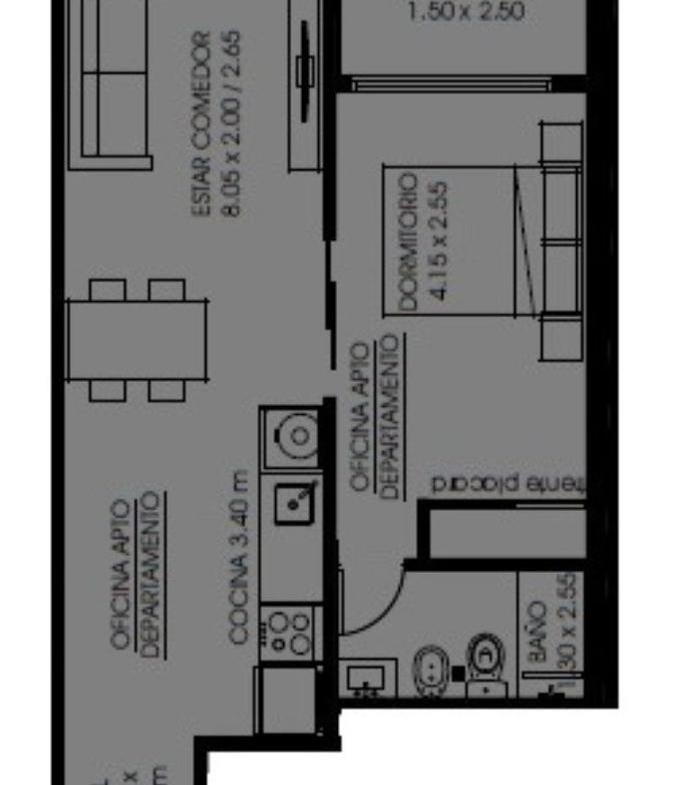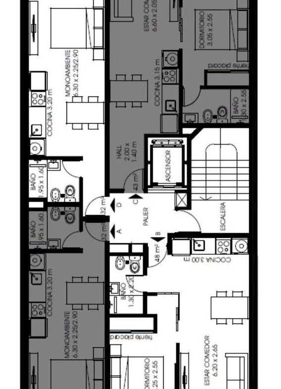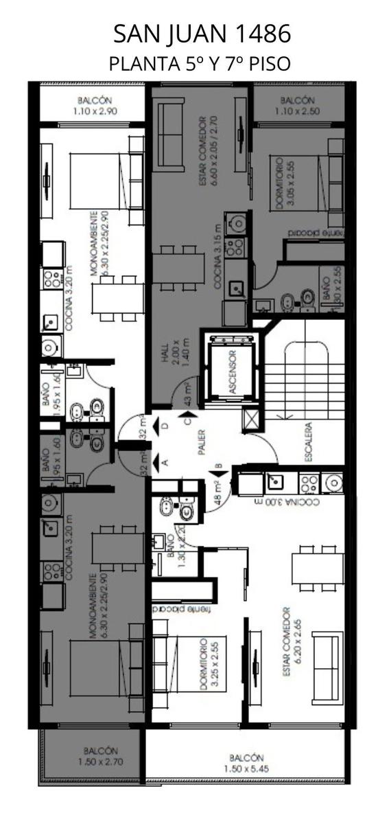 Departamentos de 1 dormitorio al contrafrente de 43 m2 con balcón. Cocina equipada incorporada al living comedor con salida al balcón. Un baño completo. Dormitorio con placard.