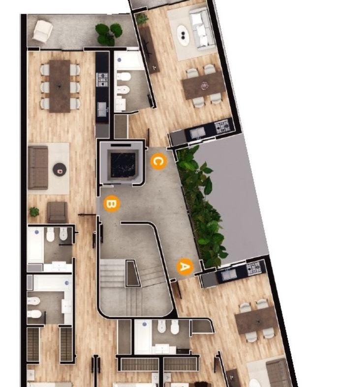 Terminaciones: Revestimientos primera marcas en cocina y baños. Pisos porcelanato primera calidad en departamentos. Enlucido de yeso en paredes interiores y cielorrasos. Carpintería de aluminio color negro anodizado. Puertas placa, marcos de madera, en ingreso departamentos e interiores. Grifería primera calidad en baños y cocinas. Sanitarios en losa blanca primeras marcas. Pileta simple de acero inoxidable primera marca en cocinas. Mesadas en granito natural en cocinas. Muebles bajo mesada y alacena en madera laminados. Calefones y termotanques Primera marca. Herrajes de puertas y muebles en marcas de primera calidad. Látex acrílico para exteriores y blanco mate en Interiores primera marca.
