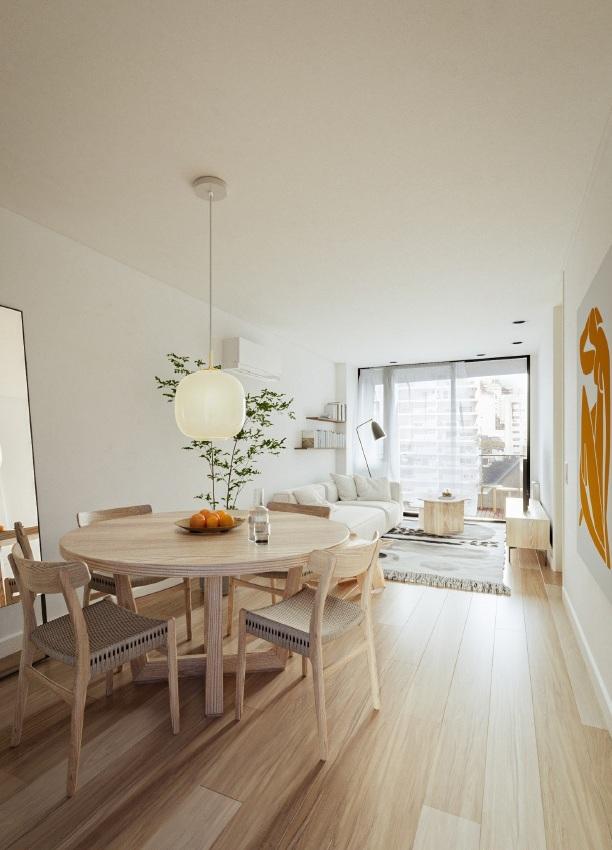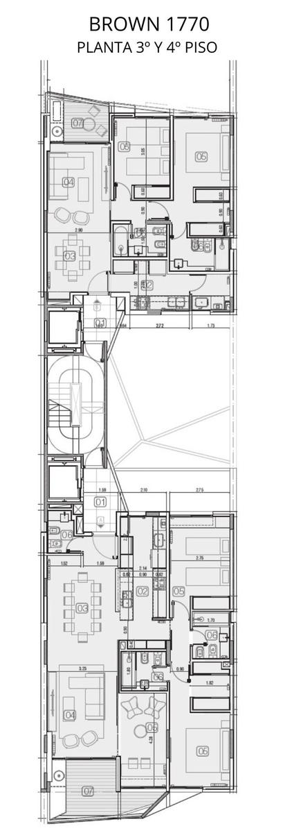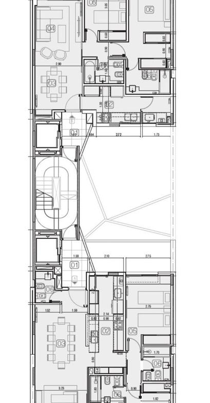 El conjunto está organizado en dos bloques uno al frente y otro al contrafrente, dividido por un patio central que permite tener ventilación cruzada en todas las unidades. Se trata de unidades exclusivas en cada bloque, de 3 dormitorios al frente y 2 dormitorios al contrafrente, junto a un dúplex con patio. Sobre el bloque del contrafrente de menor altura, se ubican los amenities, compuestos por un quincho y una piscina con solárium.