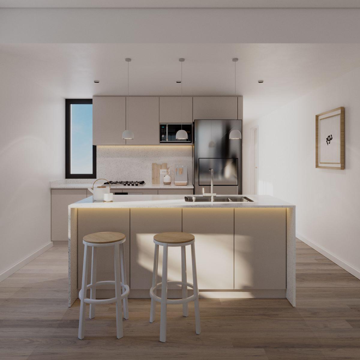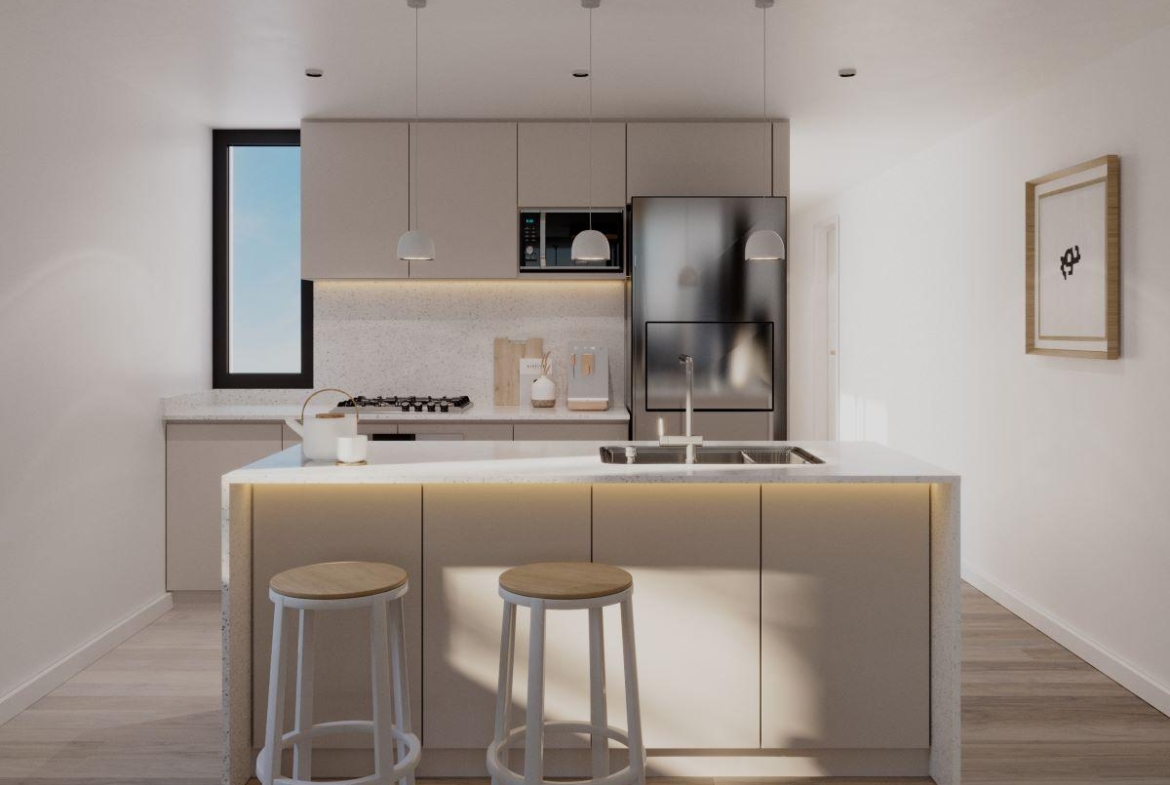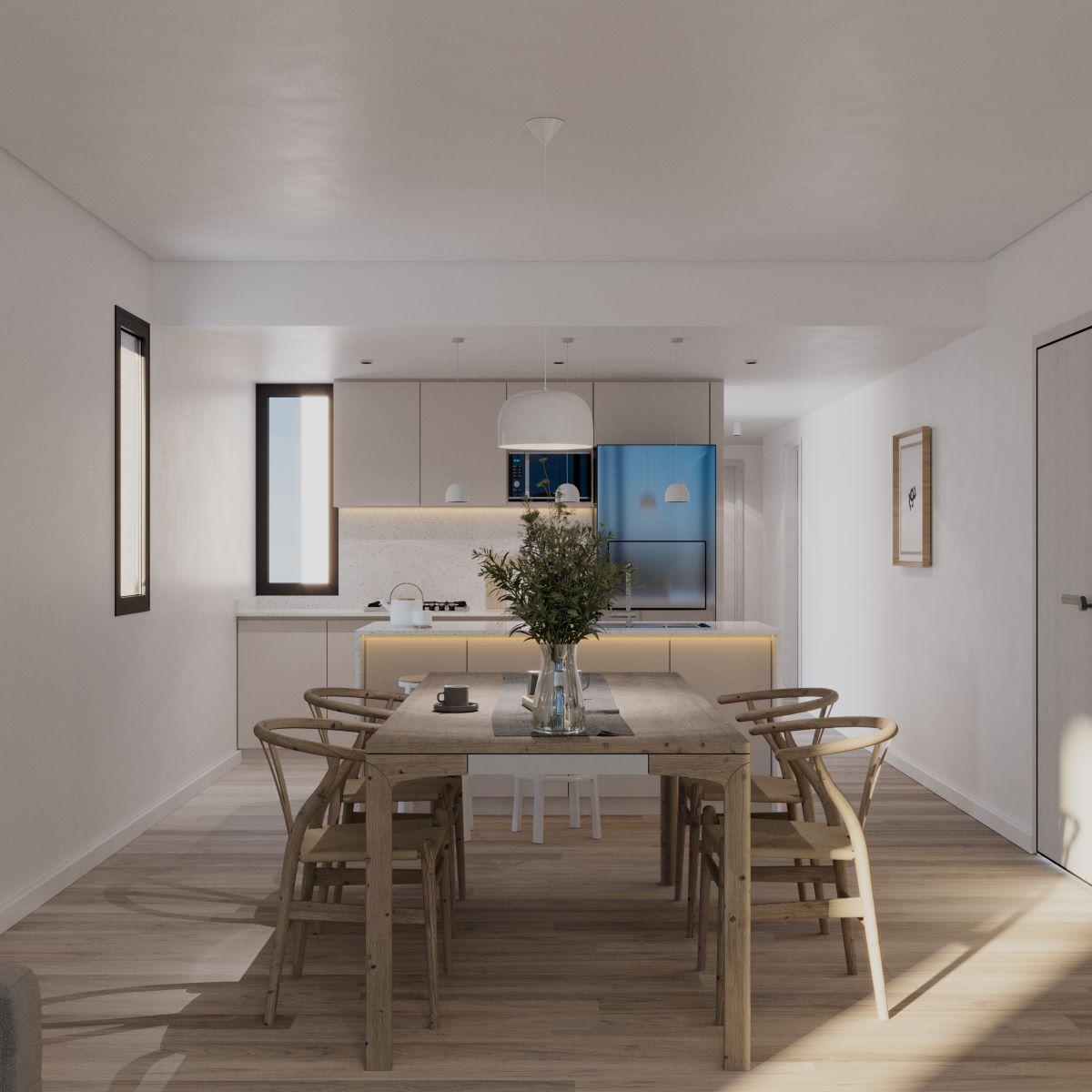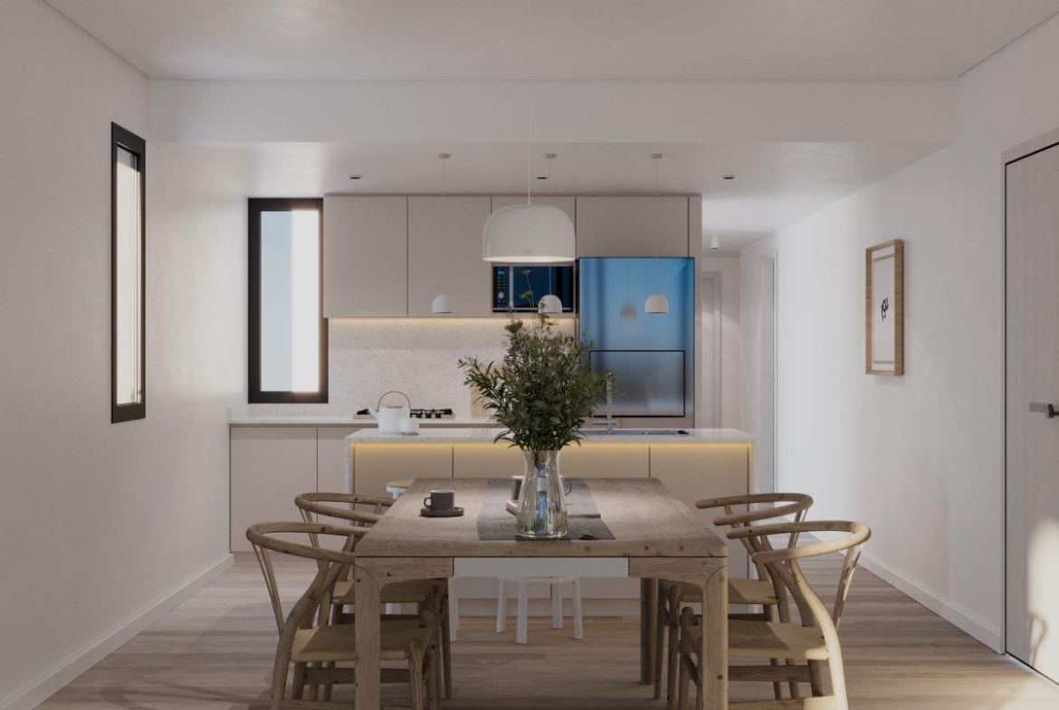 Terminaciones: Pisos de SPC símil madera calidad Premium. Aberturas exteriores en aluminio con doble vidrio y laminados de seguridad. Mesadas de cocina de mármol y bacha de acero inoxidable con grifería fv o similar. Amoblamiento de cocina de primera calidad con alacenas. Baños revestidos con porcelanato y sanitarios de primera marca. Griferías fv o similar. Placares completos con puertas corredizas y sus interiores. Calderas duales y radiadores instalados.