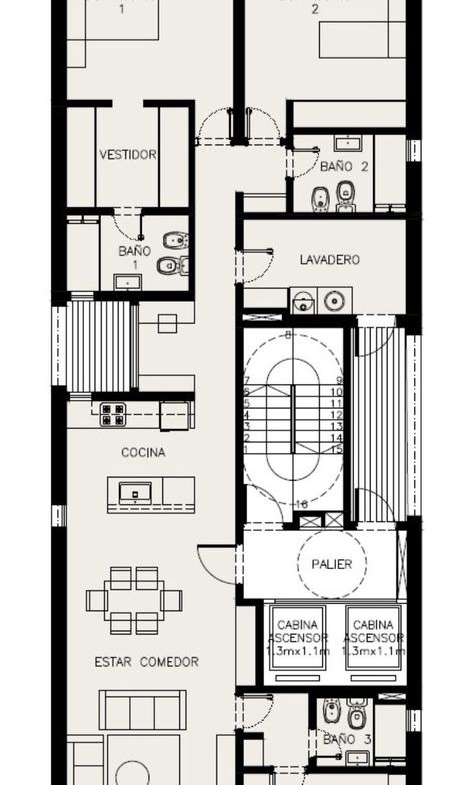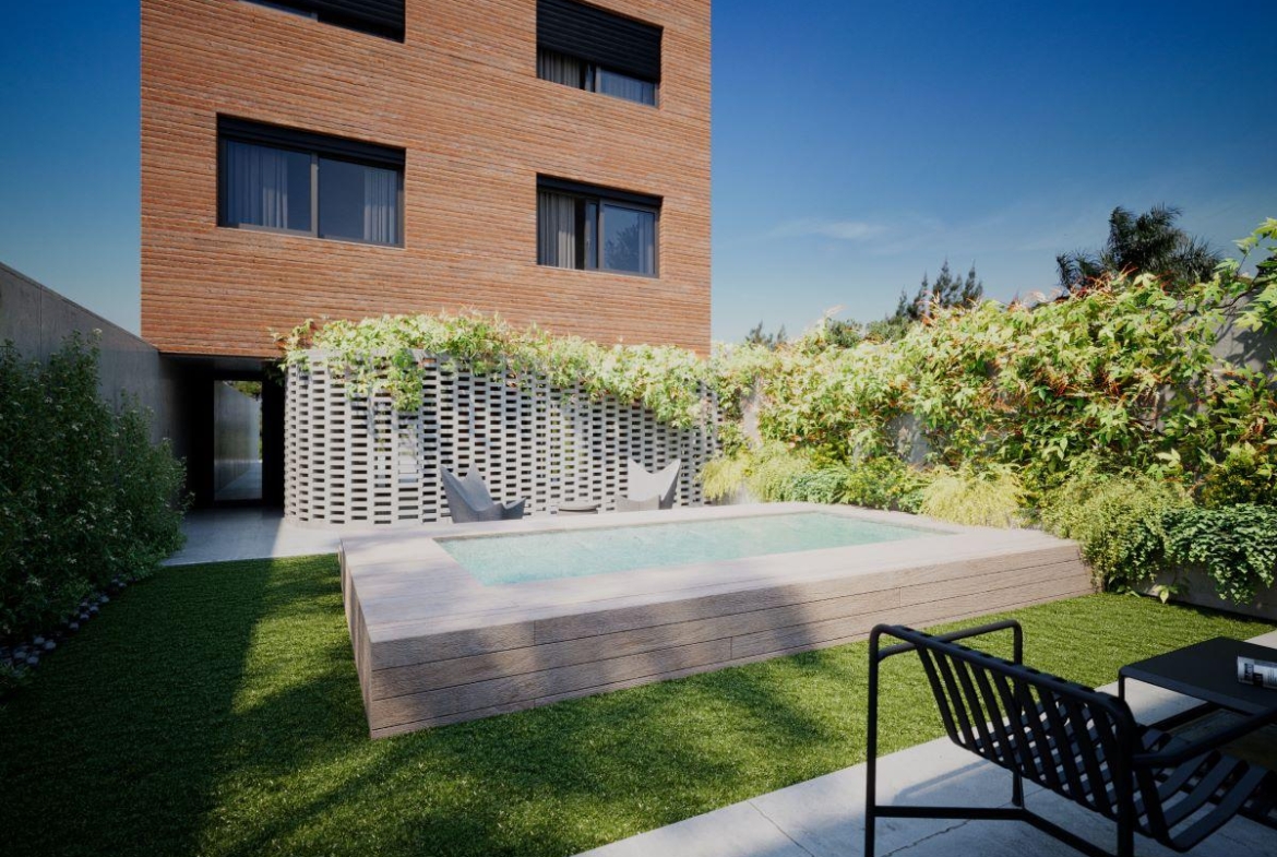 En planta baja cuenta con 6 cocheras y Hall del edificio. Piso exclusivos de 3 dormitorios del 2 al 9 piso y pisos exclusivos de 2 dormitorios 10 al 13. En 1 piso quincho con parrillero, piscina y solárium de uso común.