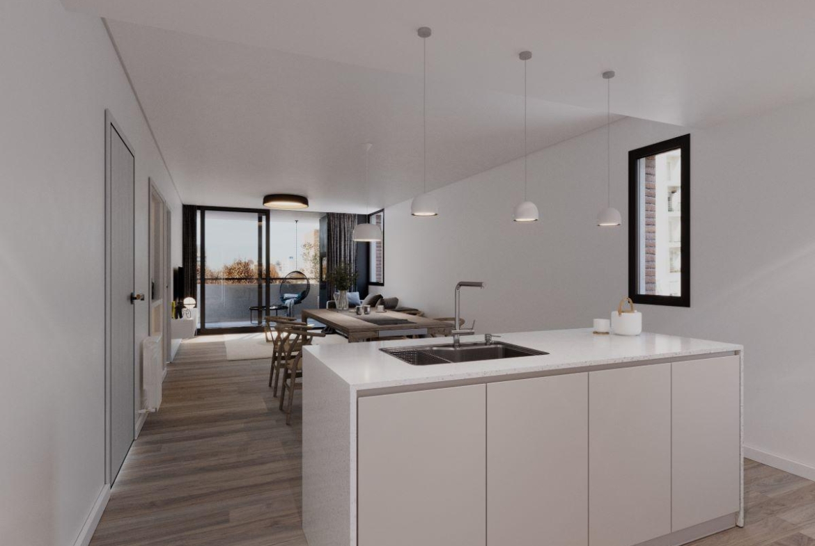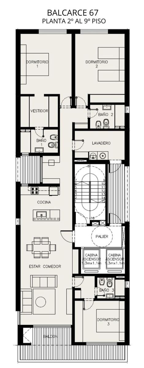 Pisos exclusivos de 3 dormitorios al frente con balcón orientado al oeste. De 160,35 m2. 135,95 m2 cubiertos y 24,30 m2 de balcones. Cocina equipada con isla. Lavadero independiente. Amplio living comedor. Tres baños completos, uno de ellos en suite. 3 Dormitorios amplios con placares, el principal con vestidor.
