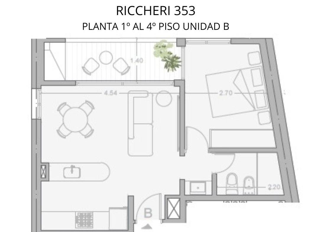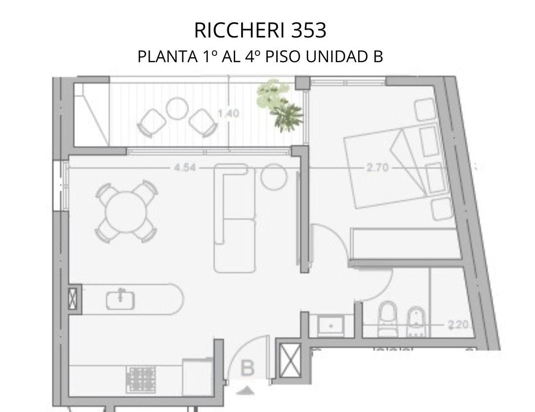 Departamento de 1 dormitorio contrafrente este de 46,65 m2, 40 m2 cubiertos y 6,65 m2 de balcón con parrillero propio. Cocina semiseparada por barra. Baño con antebaño. Dormitorio con Placard.