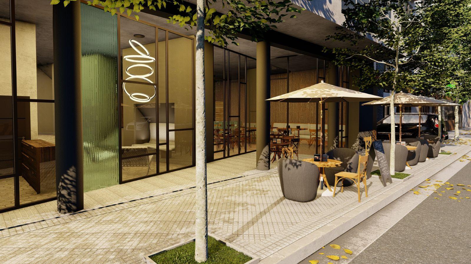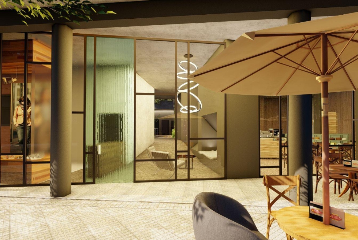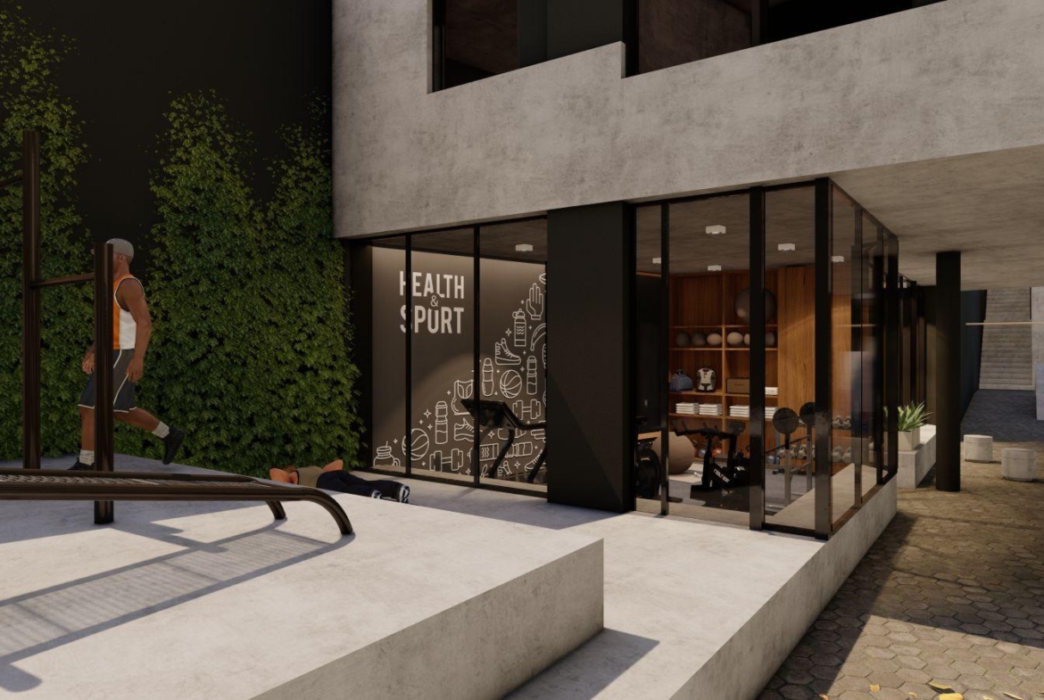 El edificio cuenta con grandes superficies de espacios abiertos arbolados, un nivel subterráneo de cocheras, locales comerciales en planta baja y cuatro pisos altos de departamentos de uno, dos y tres dormitorios. Cada una de las unidades cuenta con amplios balcones terrazas. El nivel superior cuenta con terrazas exclusivas en la azotea. Este desarrollo inmobiliario es en esencia un edificio de cómodas viviendas contemporáneas.