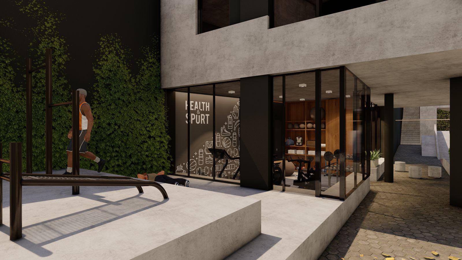 Patio interno con carácter de hall al aire libre. Su uso en planta baja es de distribuidor principal peatonal a todo el edificio, es un espacio a cielo abierto desde donde dirigirse a todos los sectores: recreativos, deportivos y de viviendas. Forestado con jardines verticales, canteros y un árbol que emerge desde el subsuelo cuyo objetivo es oxigenar, silenciar, y dar sombra a este lugar.