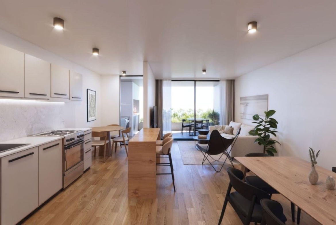 El proyecto ofrece 26 departamentos de 1, 2 y 3 dormitorios, con una arquitectura contemporánea, sobria y funcional. Cada unidad fue diseñada para aprovechar al máximo la luz natural, con ambientes amplios, terminaciones de calidad y vistas al verde que rodea el conjunto.