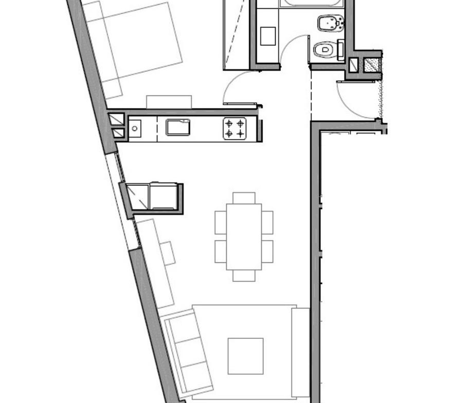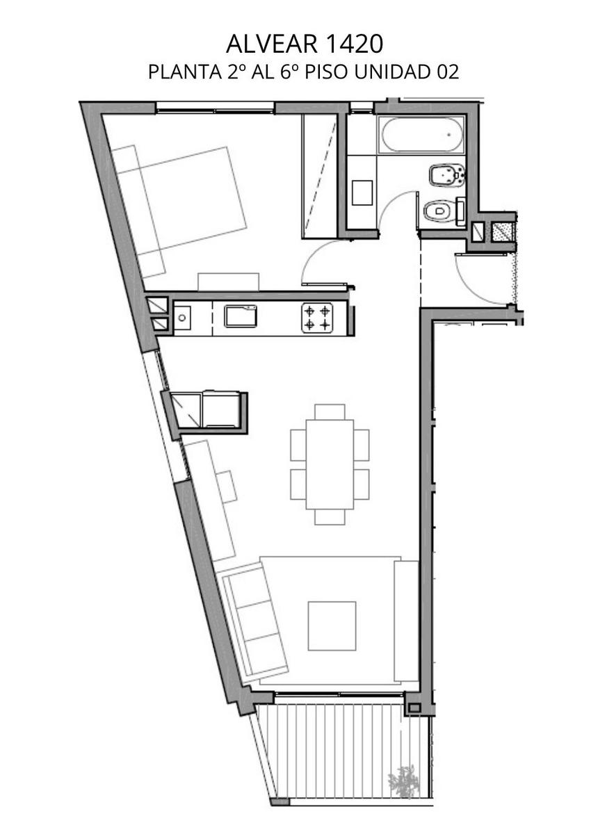 Departamento de 1 dormitorio frente de 52.65 m2. 47.99 m2 cubiertos y 4.66 m2 de balcón. Ventilación Cruzada. Ingreso a living comedor con salida al balcón frente. Cocina integrada. 1 un dormitorio con placard al contrafrente y baño completo.