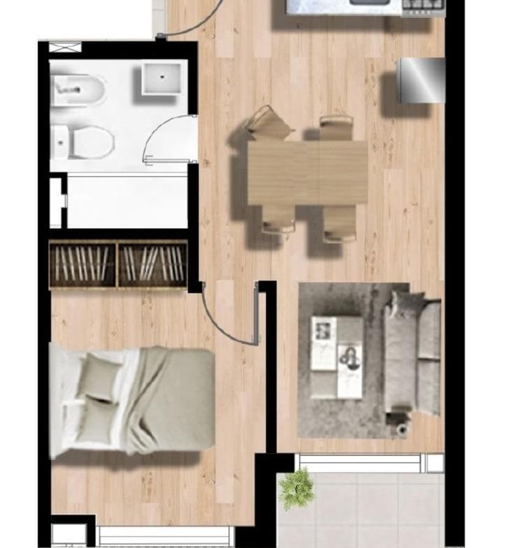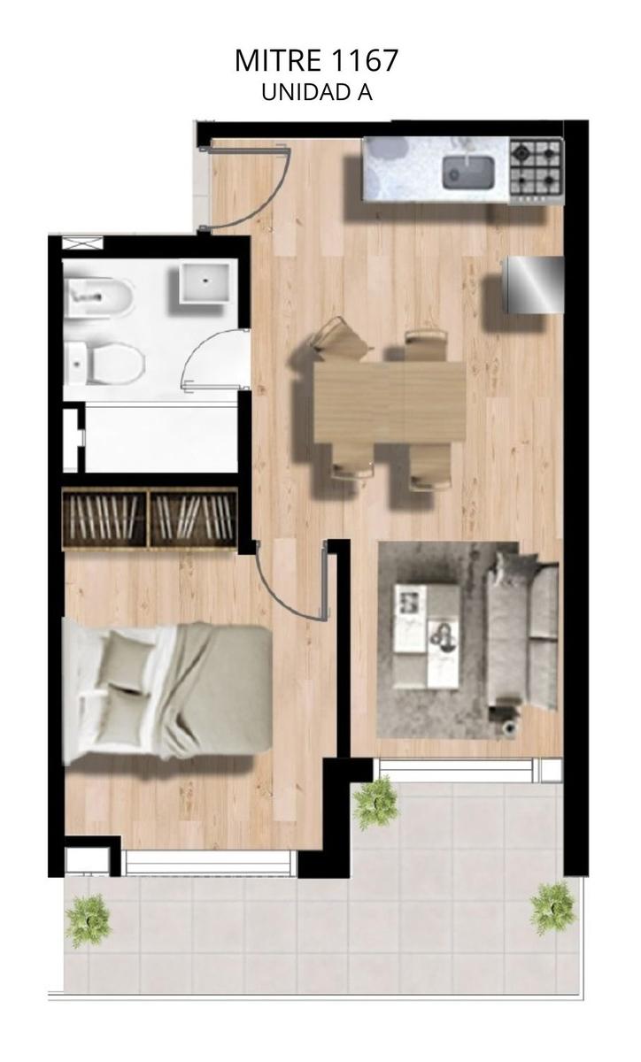 Departamentos A de 1 dormitorio al frente Medianera Sur de 42.80 m2. 36.02 m2 exclusivos y 6.78 m2 de balcón corrido. Amplio living comedor con salida al balcón corrido. Cocina completa incorporada. Dormitorio con placard. Un baño completo.