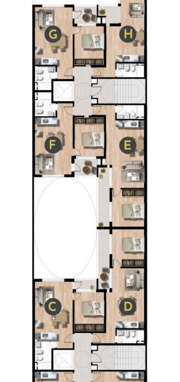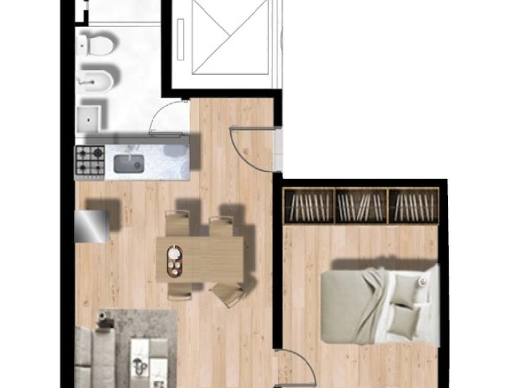 Departamentos F de 1 dormitorio frente internos medianera norte miran hacia Torre I de 47.42 m2, 38.50 m2 exclusivos más 8.92 m2 de balcón. Amplio living comedor con salida al balcón. Cocina completa incorporada. Dormitorio con placard. Un baño completo.