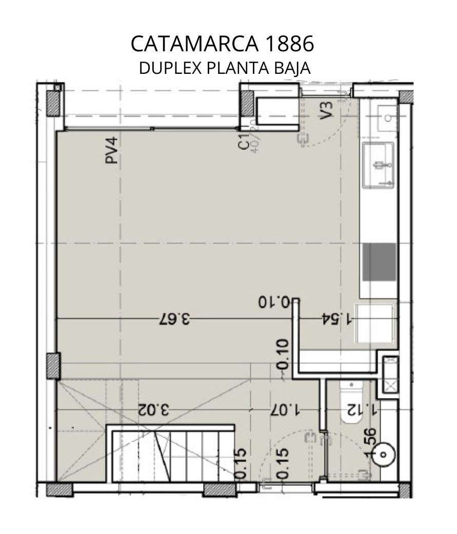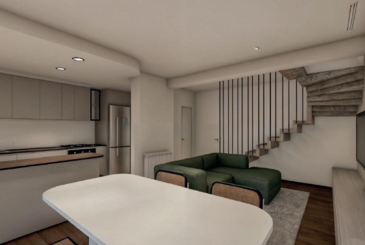 Departamento dúplex de 2 dormitorios de 74.40 m2 con balcón. Planta baja: Living comedor, cocina semiseparada por barra desayunadora y toilette de recepción. Planta alta 2dormitorios con placard uno con salida al balcón y baño completo.
