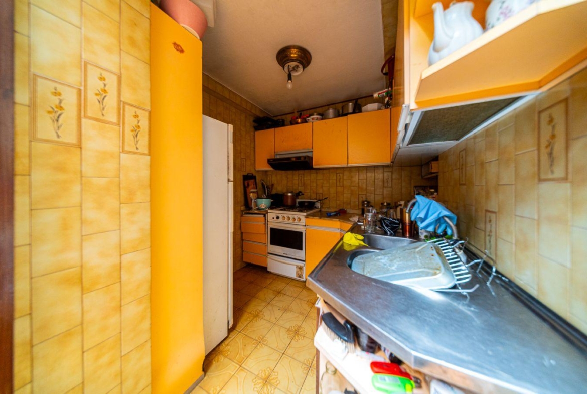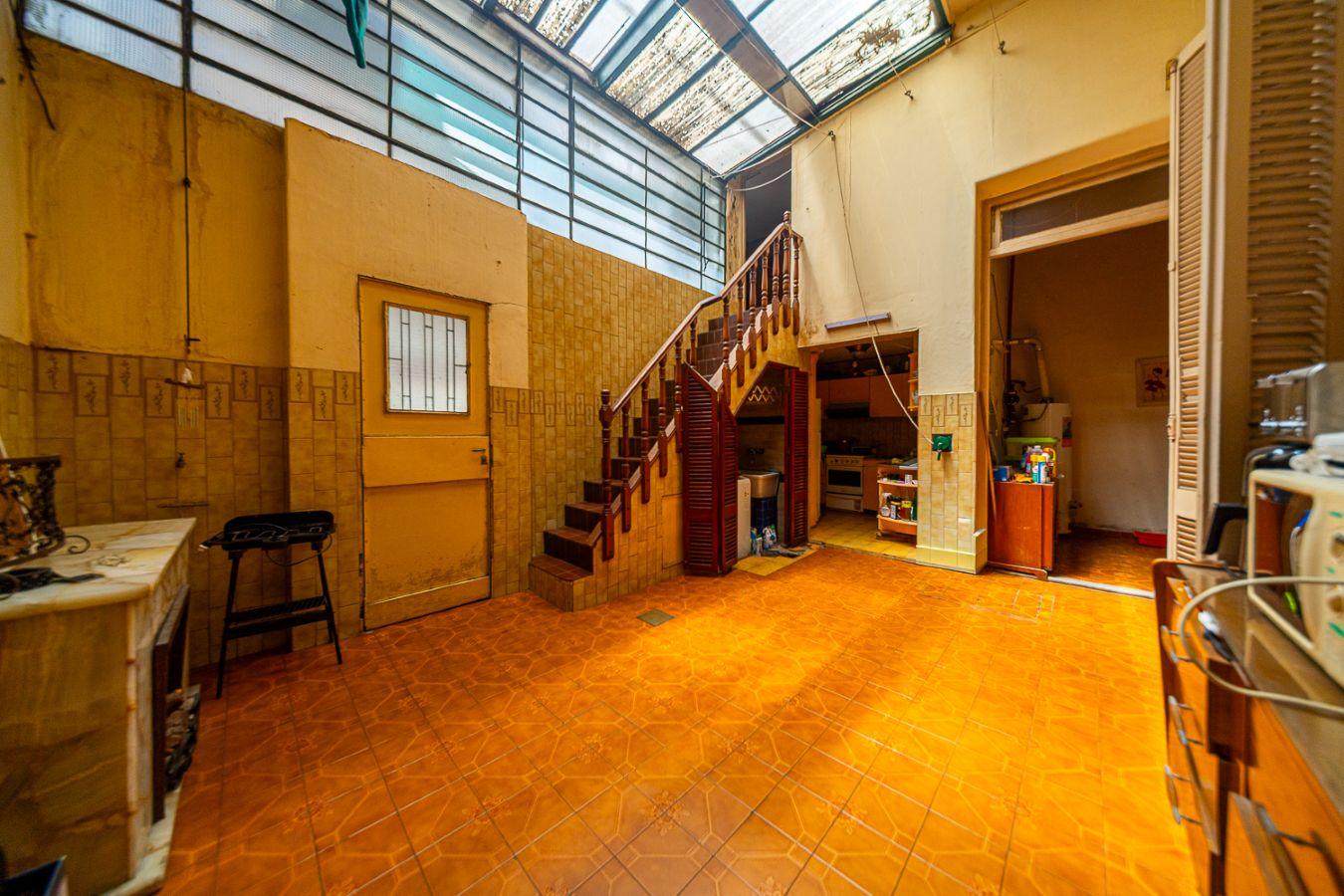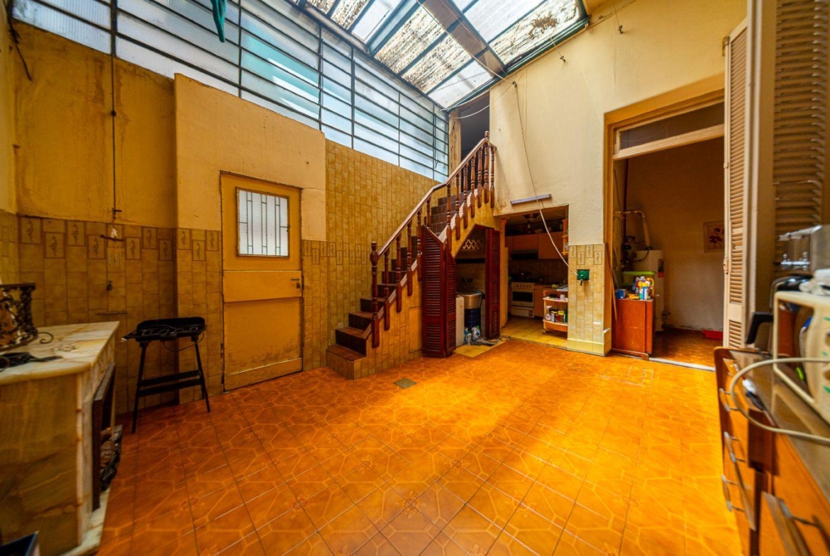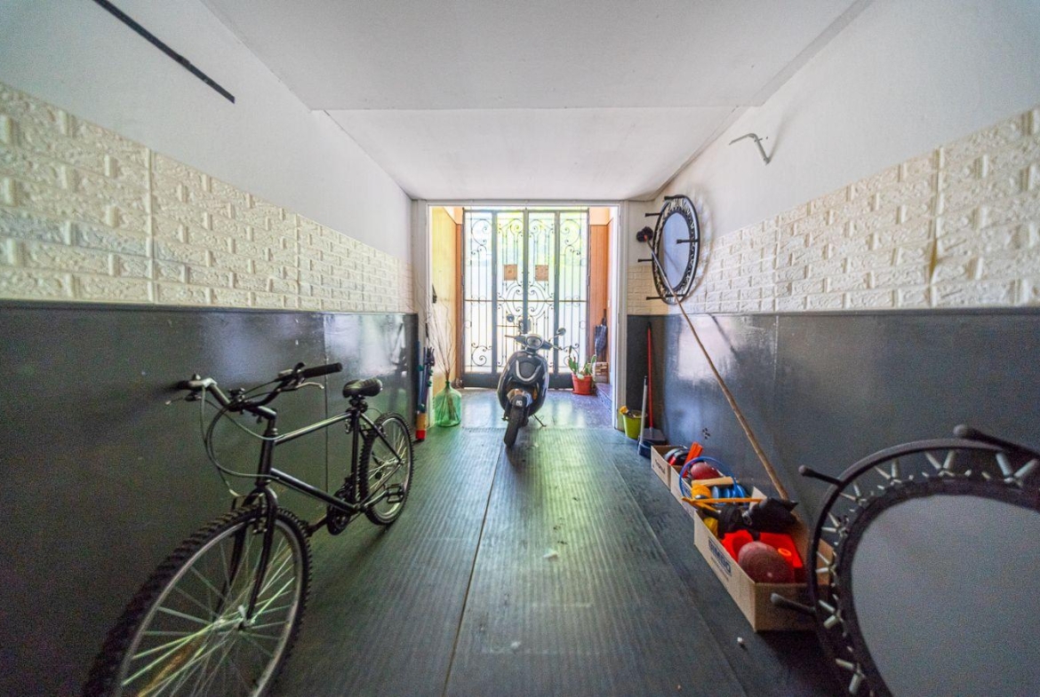Desarrollada en planta baja con cochera y patio. Con doble ingreso, mediante pasillo lindero o por el portón de cochera se accede a un hall de distribución y de ahí al Living comedor. La casa se desarrolla alrededor del patio central con cerramiento a donde ventilan los 2 dormitorios, comedor y cocina independiente. El lavadero se encuentra bajo la escalera que conduce a una planta alta donde se encuentra otro dormitorio. El baño es completo de grandes dimensiones.