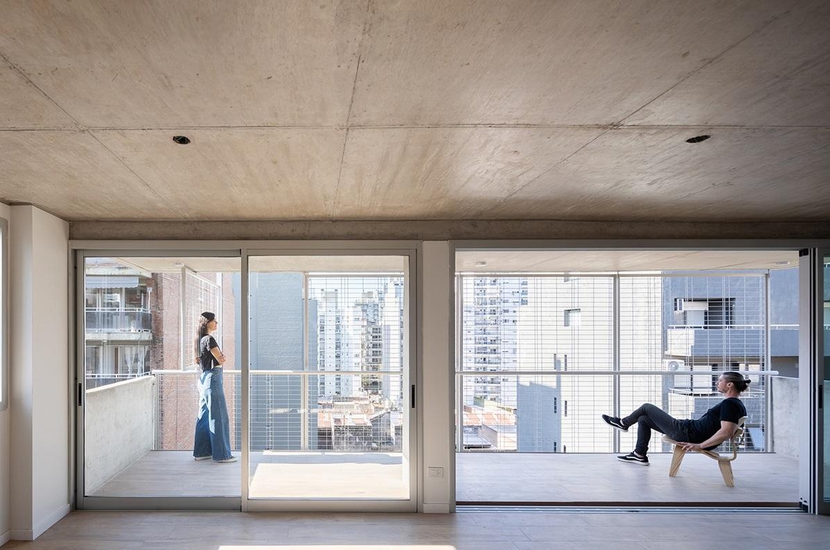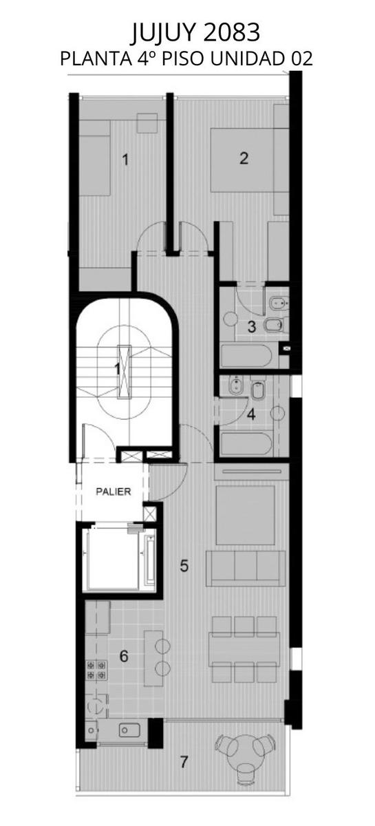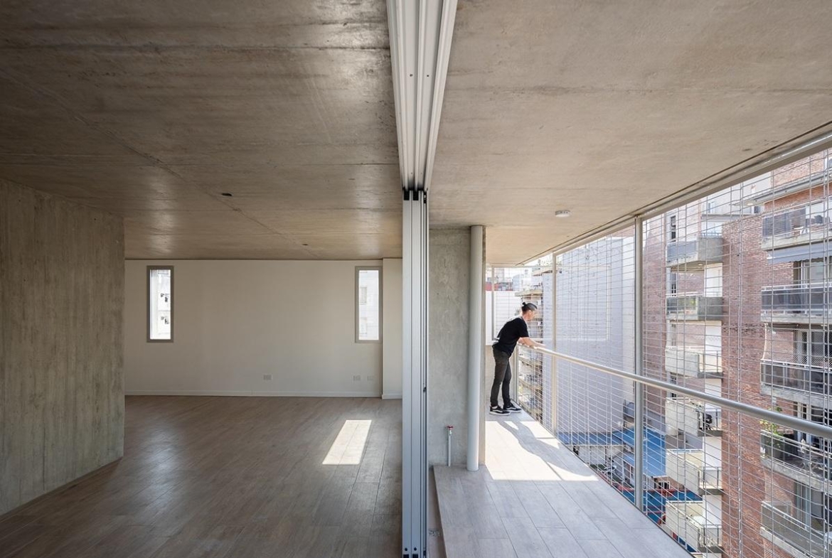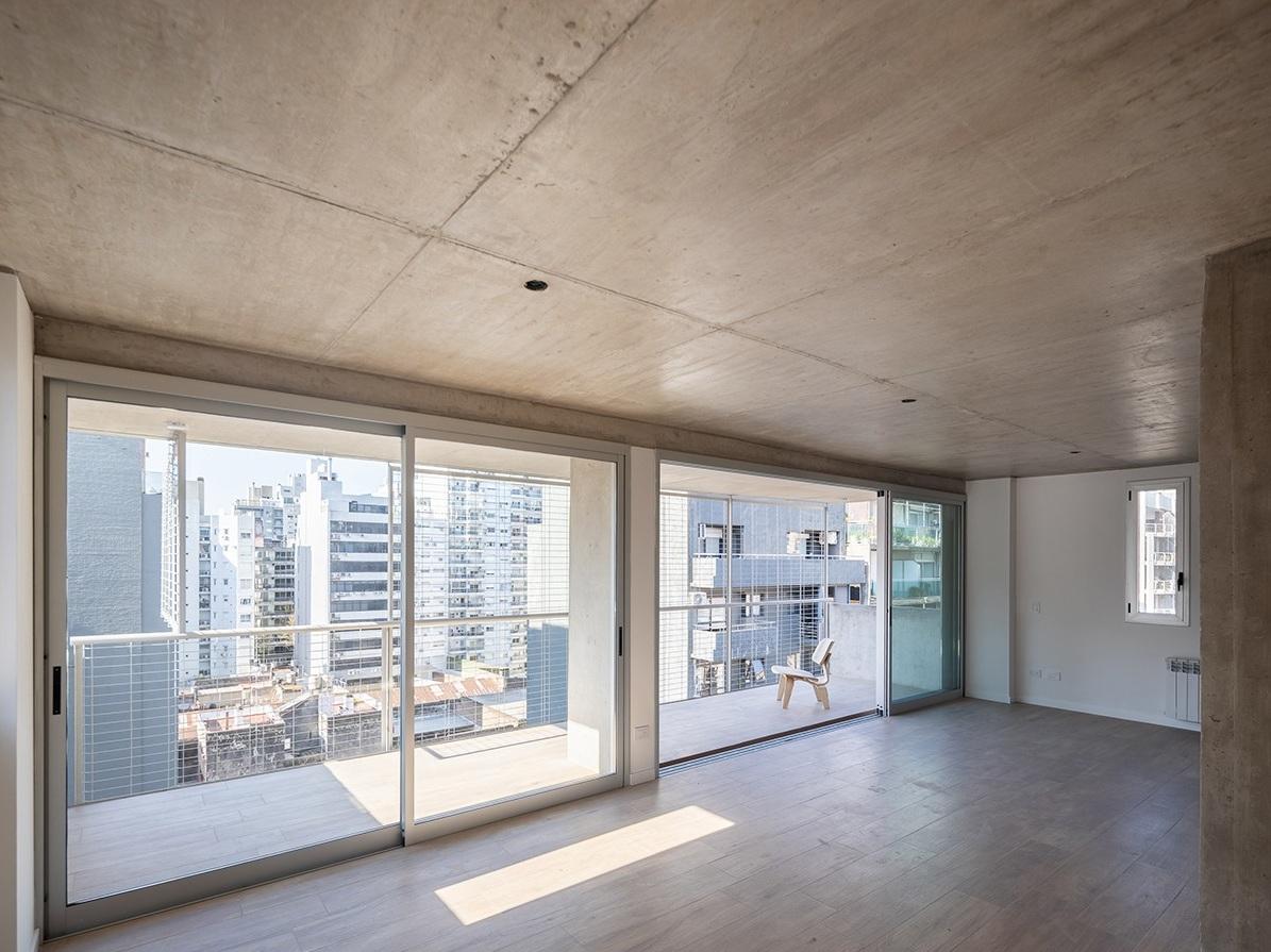 Departamento semipiso de dos dormitorios de 81.55 m2 con balcón. 73.05 m2 cubiertos y 8.50 m2 de balcón. Ventilación cruzada. Ingreso a estar comedor con cocina incorporada y salida a balcón al frente. Al contrafrente 2 dormitorios el principal en Suite con vestidor y escritorio. Segunda habitación con placard. Baño completo.