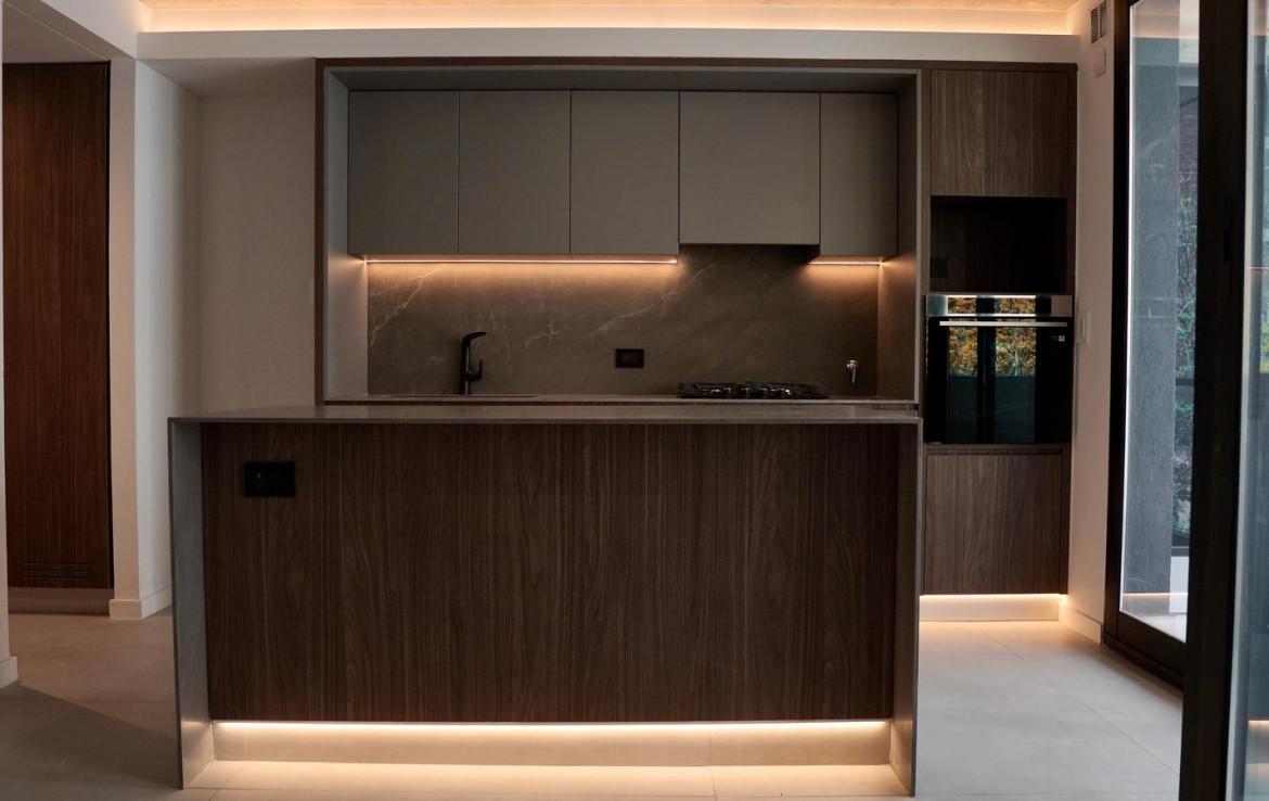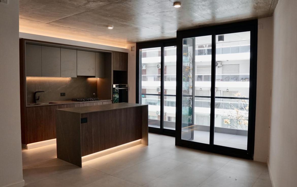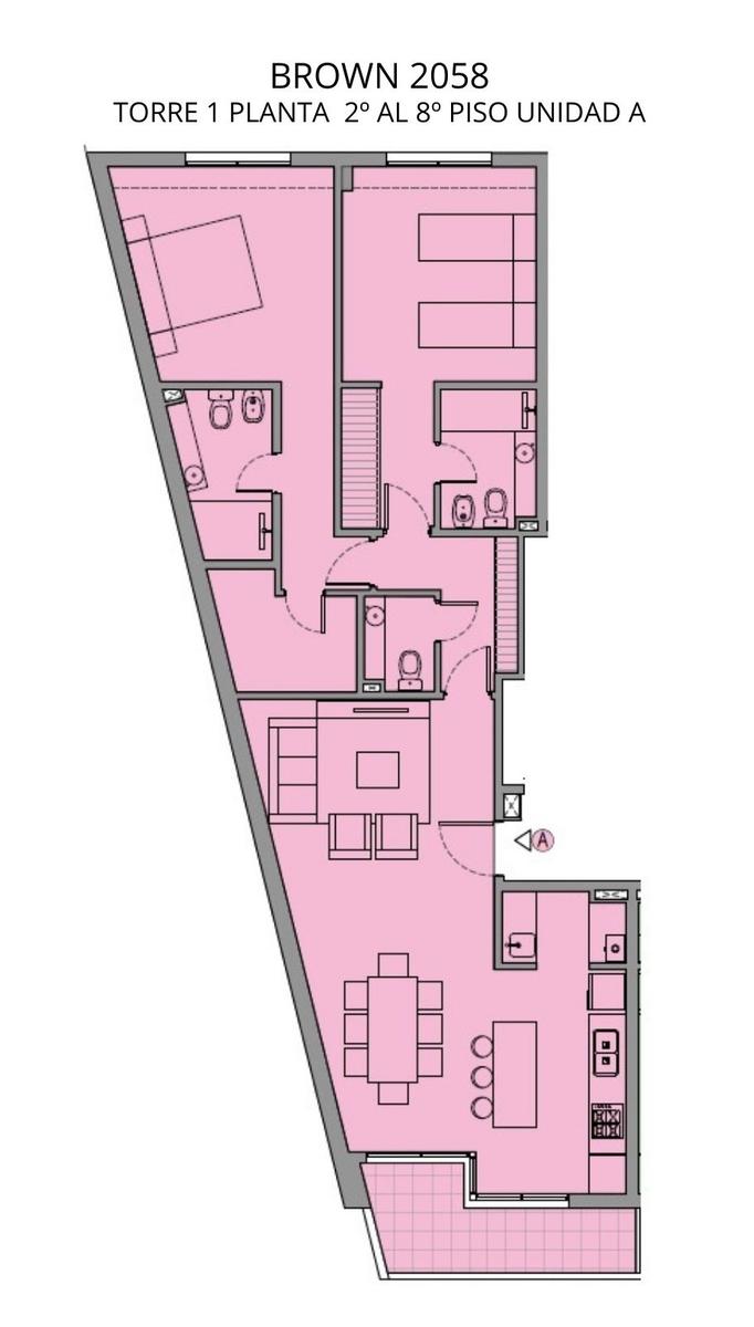 Semipiso A de 2 dormitorios de 106 m2 con balcón. 101 m2 cubiertos y 5 m2 de balcón. Ventilación cruzada. Ingreso a living comedor con cocina semiseparada con isla y salida al balcón frente. Lavadero. Al contrafrente dos dormitorios en suite uno con vestidor y otro con placard con interiores terminados. Toilette.