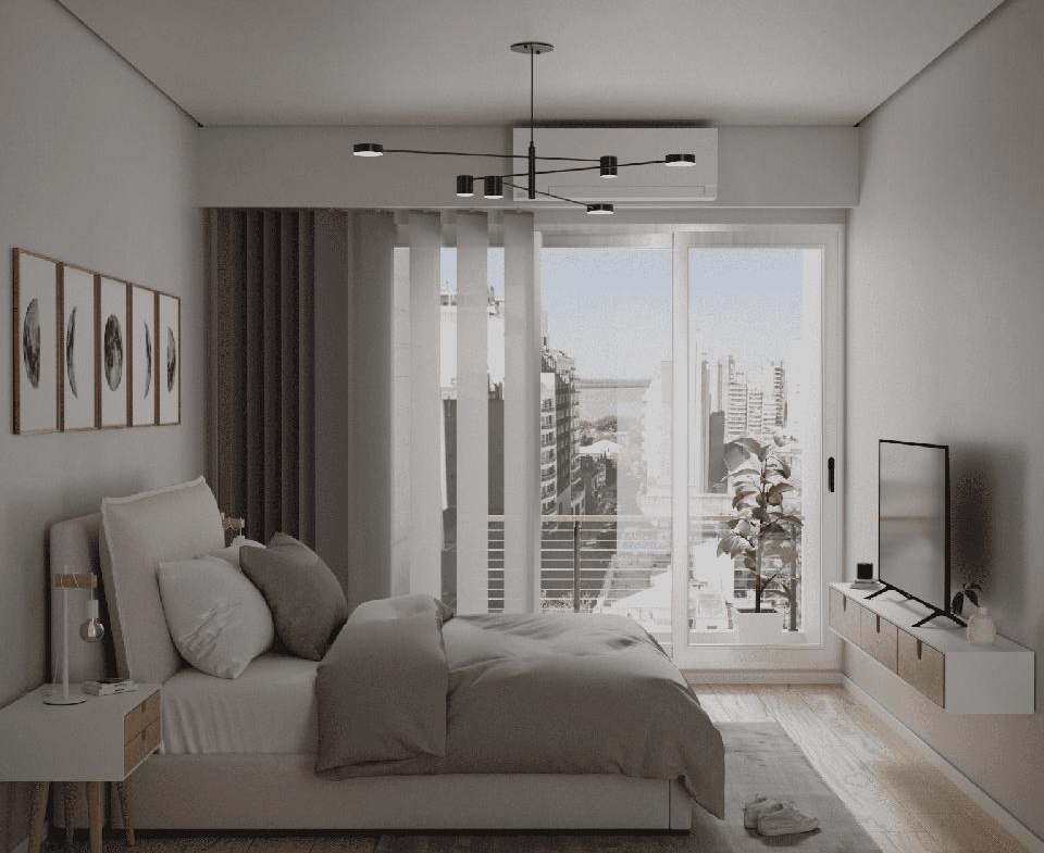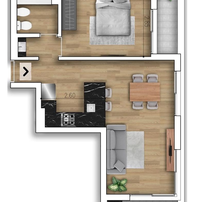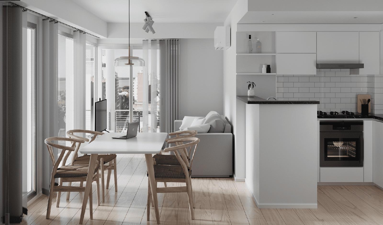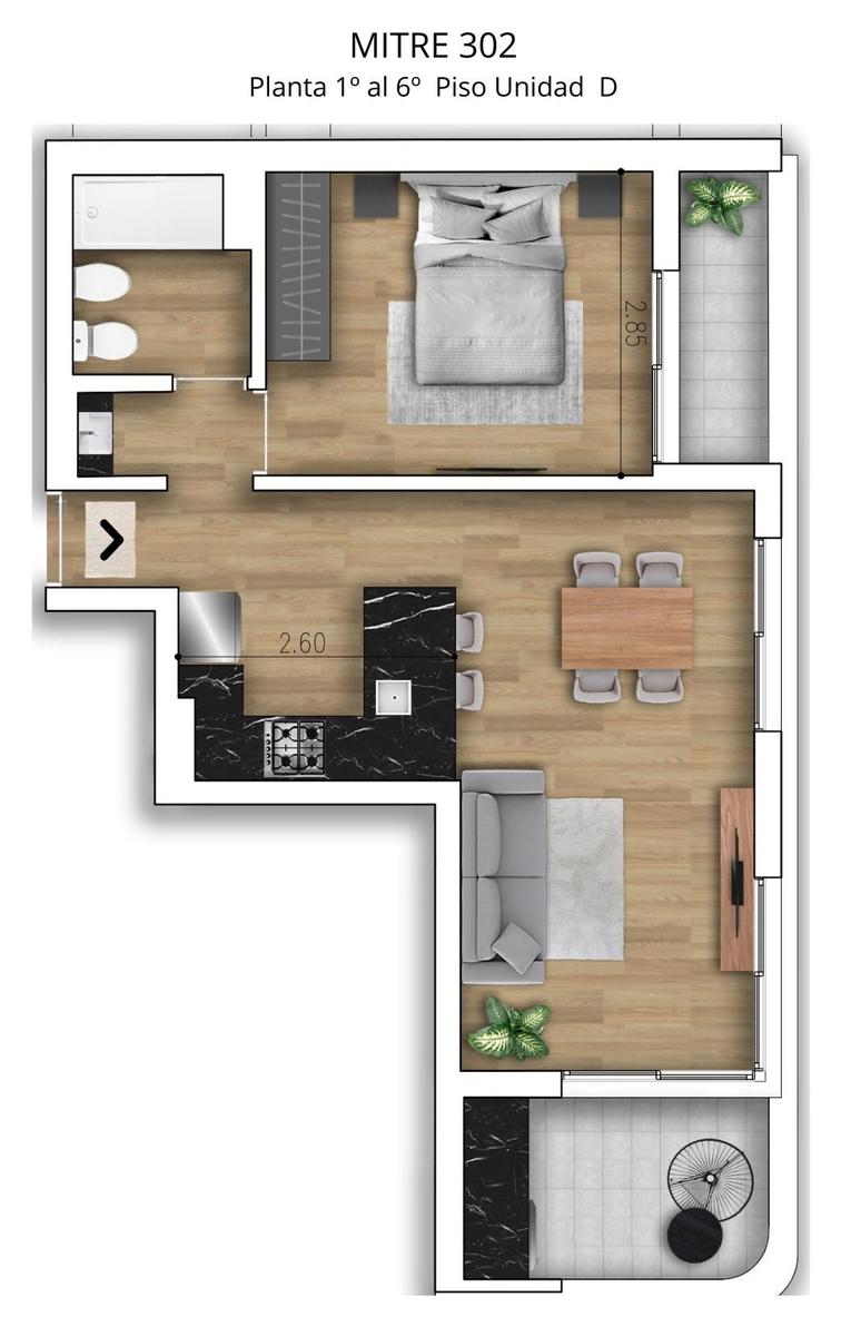 Departamento de 1 dormitorio al frente en Esquina de 53,0 m2. 44.5 m2 cubiertos y 8,50 m2 de balcones. Cocina equipada semi separada por barra del living comedor. Un baño completo. Dormitorio con placard.