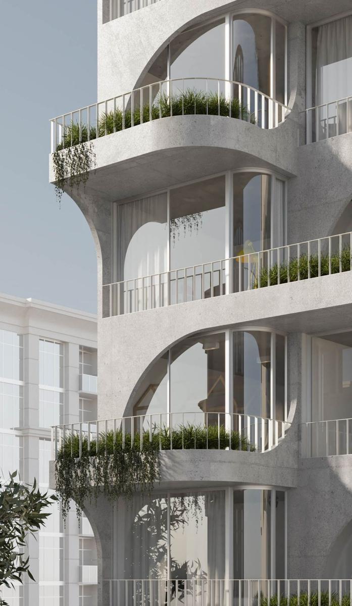 El proyecto, como su nombre lo indica, se caracteriza principalmente por la fuerte presencia de arcos y por sus amplios balcones aterrazados de doble altura.