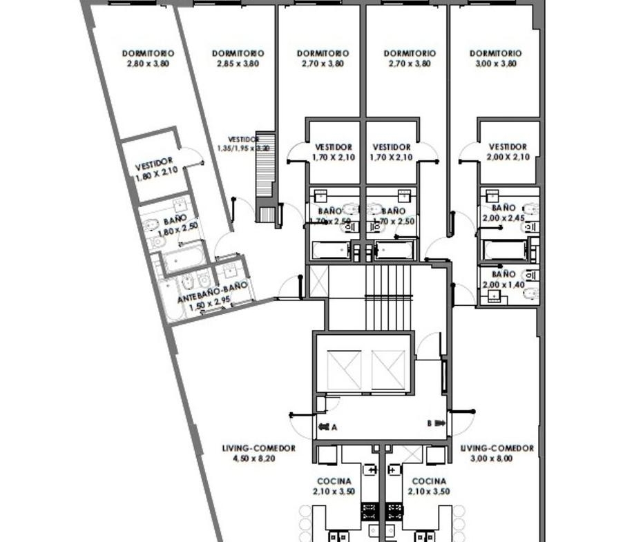 Compuesto por semipisos de dos y tres dormitorios y dos pisos exclusivos. 2 niveles de cocheras.