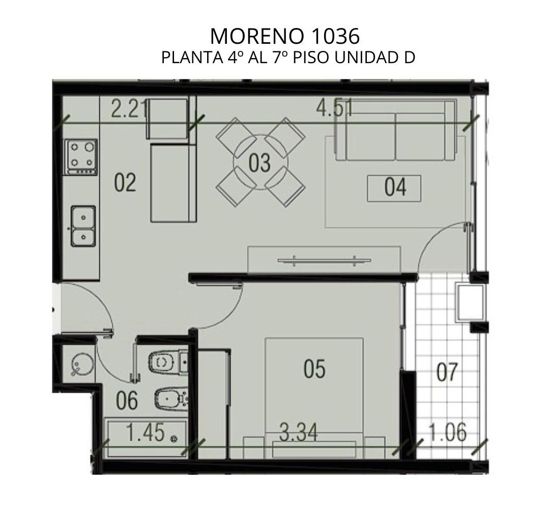 Departamento Premium en venta de 1 dormitorio ubicado en Moreno y San Luis, Orientación norte. De 43.20 m2 con balcón. 39.7 m2 cubiertos y 3.60 m2 de balcón. Ingreso a living comedor con salida al balcón. Cocina semiseparada por barra dayunadora. Dormitorio con Placard y salida al balcón y Baño completo.
