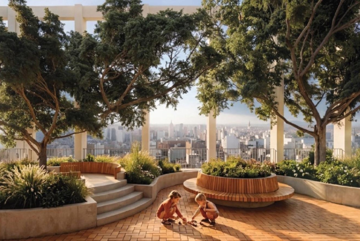 Una plaza con árboles de más de 200 metros cuadrados de superficie a más de 70 metros de altura y con vista panorámica 360 de la ciudad en pleno centro.