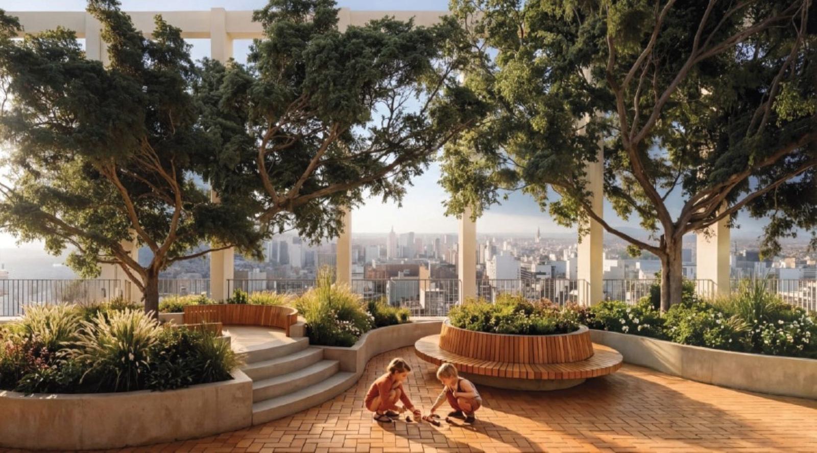 Una plaza con árboles de más de 200 metros cuadrados de superficie a más de 70 metros de altura y con vista panorámica 360 de la ciudad en pleno centro.