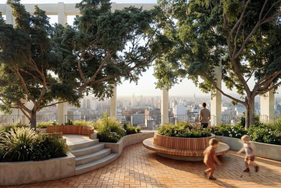 Una plaza con árboles de más de 200 metros cuadrados de superficie a más de 70 metros de altura y con vista panorámica 360 de la ciudad en pleno centro.