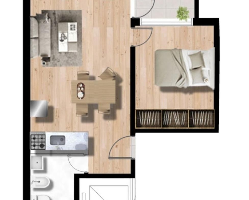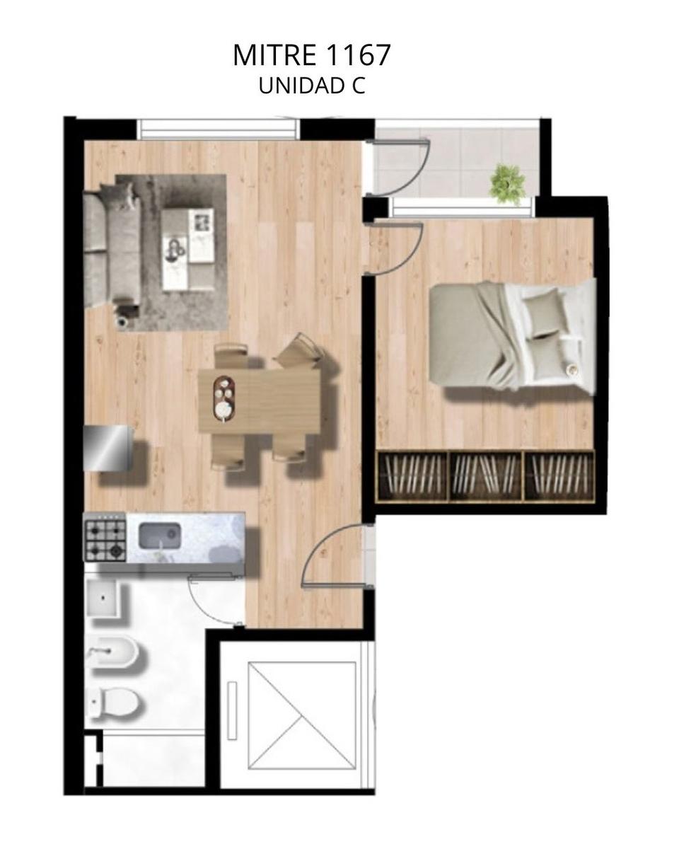 Departamentos C de 1 dormitorio contrafrente mira a la torre II. Medianera norte de 40.68 m2. 39 m2 exclusivos y 1.68 m2 de balcón. Amplio living comedor con salida al balcón. Cocina completa incorporada. Dormitorio con placard. Un baño completo.