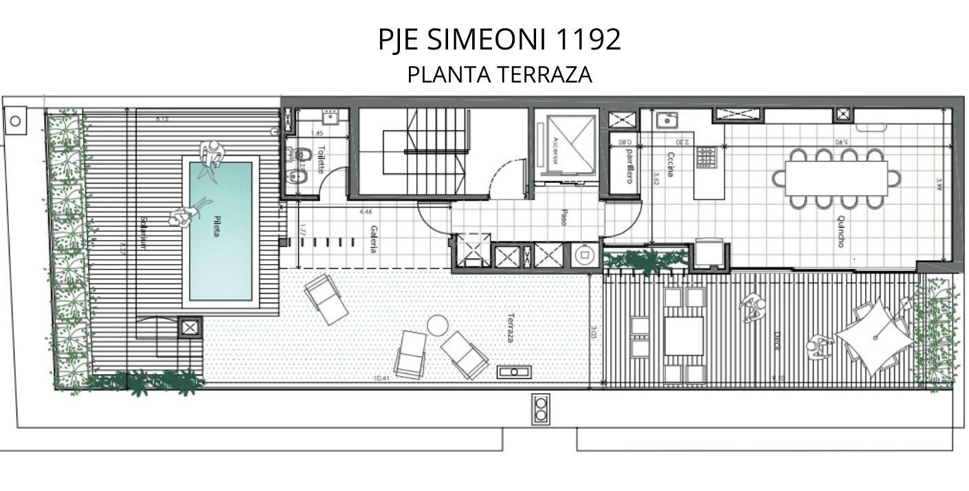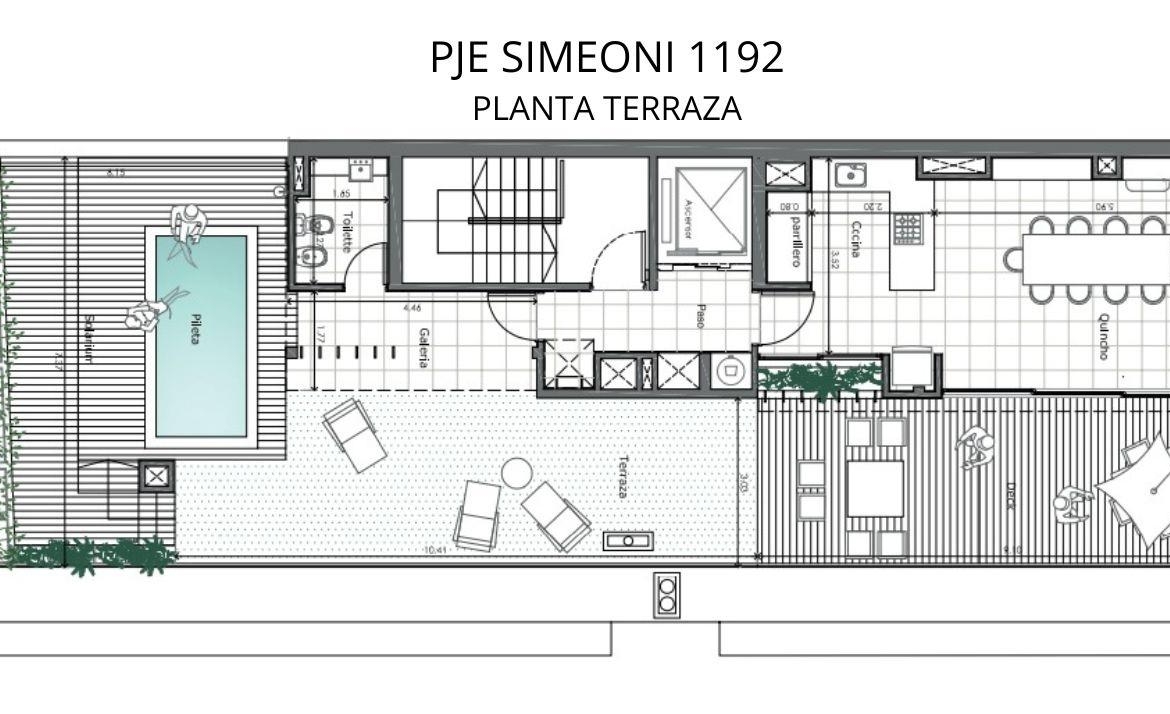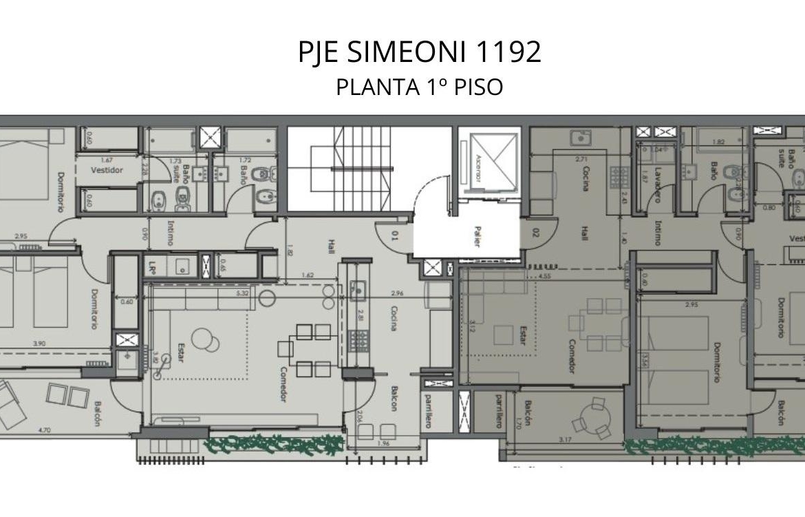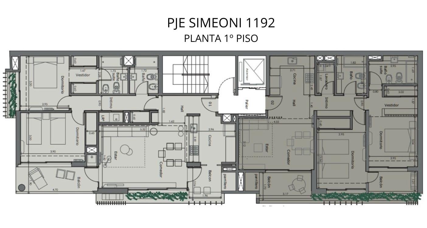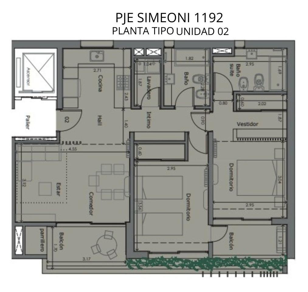 Departamento de 2 dormitorios en frente por Pje Simeoni de 93.34 m2 exclusivos de 78.40 m2 cubiertos y 14.94 m2 de balcones. Ingreso a cocina integrada, Amplio living comedor con salida al balcón con parrilla, 2 dormitorios con placares el principal en suite. Lavadero. Baño completo.